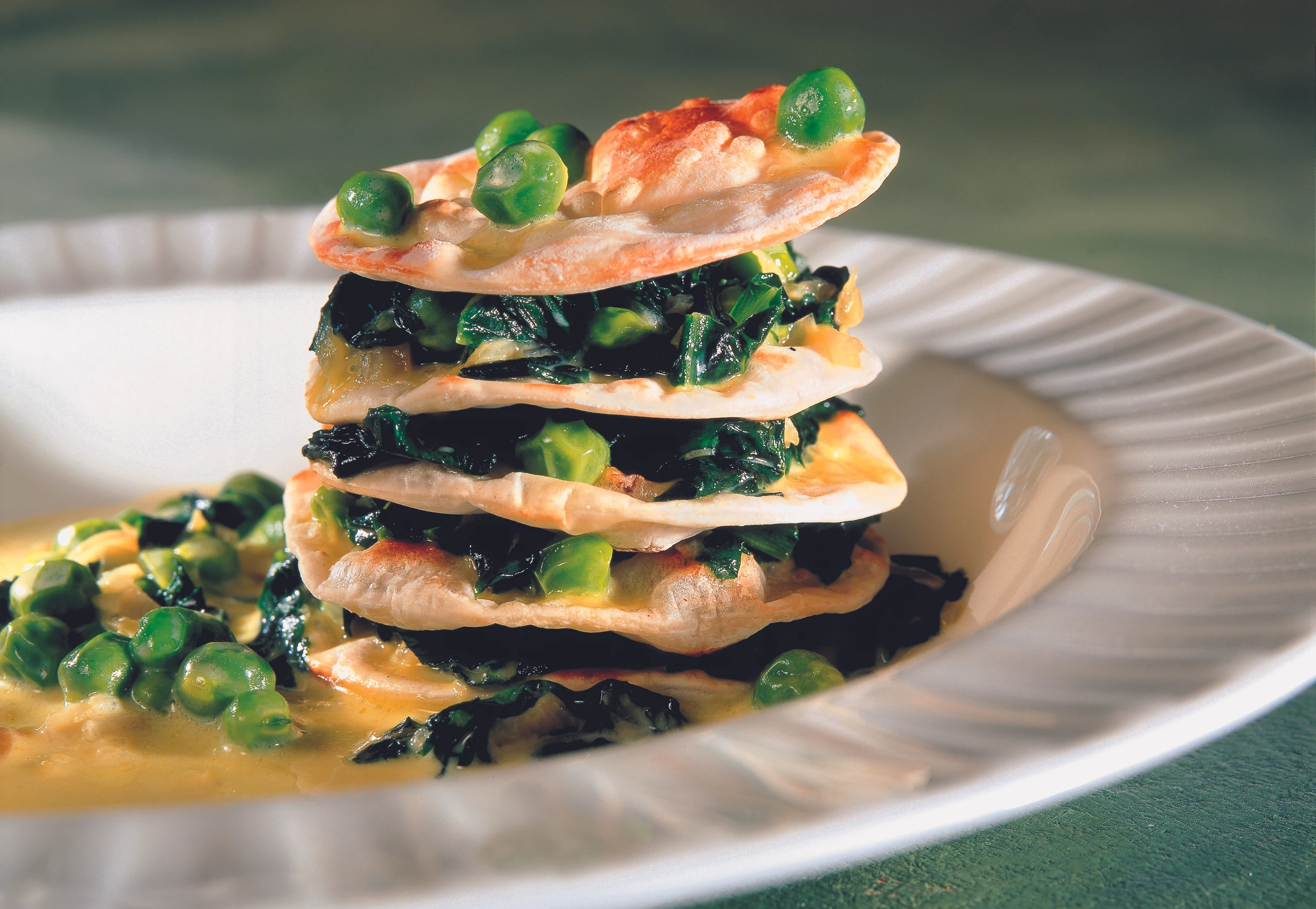 Bärlauchlasagne mit Erbsen und Erdäpfelsauce