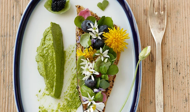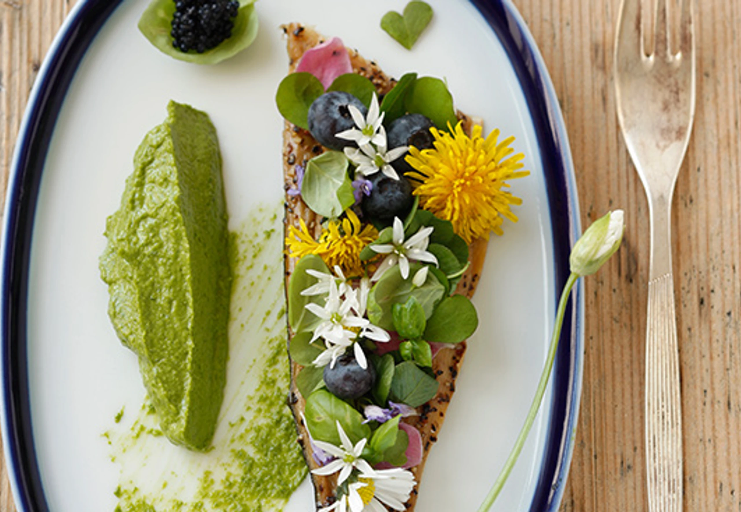 - Kaviar in die größeren Basilikumblätter setzen. Makrelenfilets, Bärlauchpüree und Kaviargarnitur auf Tellern anrichten. Filets mit Blüten dekorativ belegen, mit Olivenöl beträufeln und servieren. Dazu passt Schwarzbrot.
