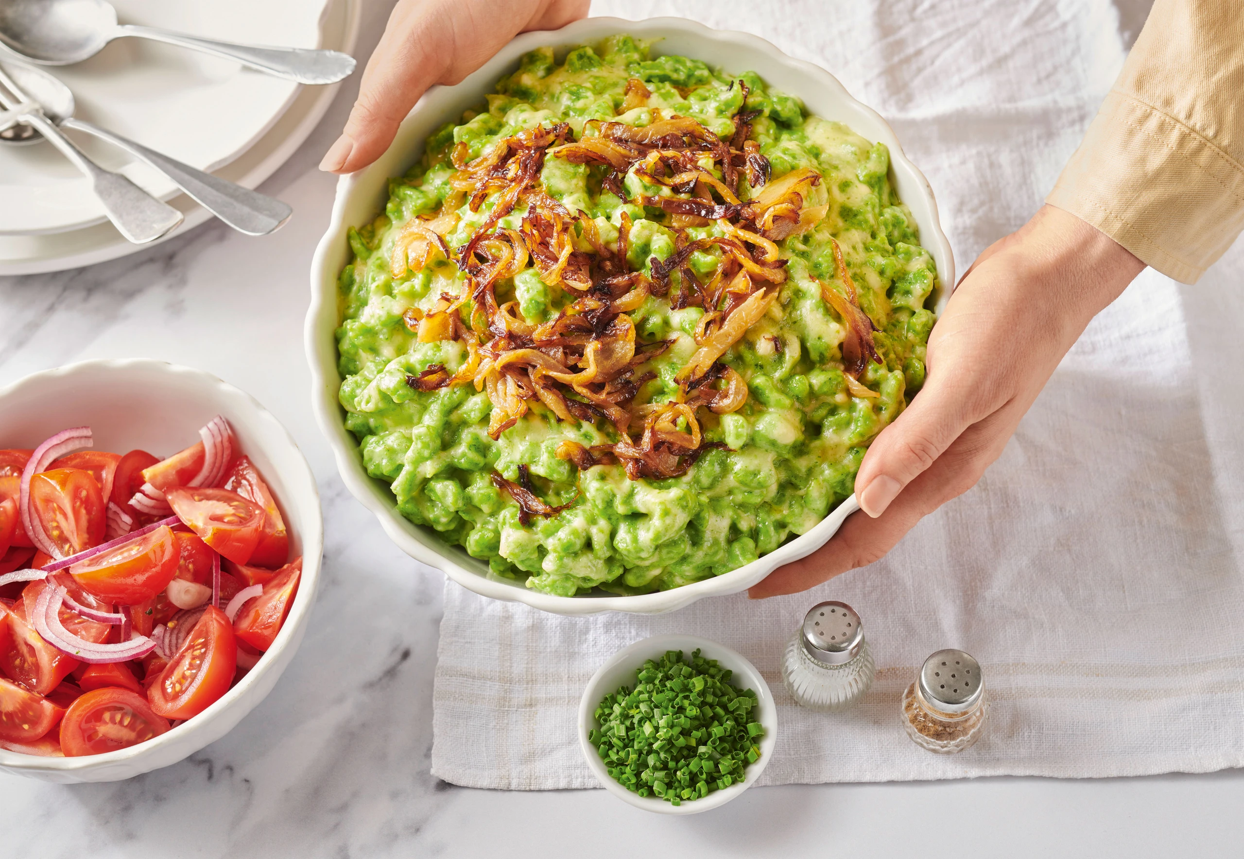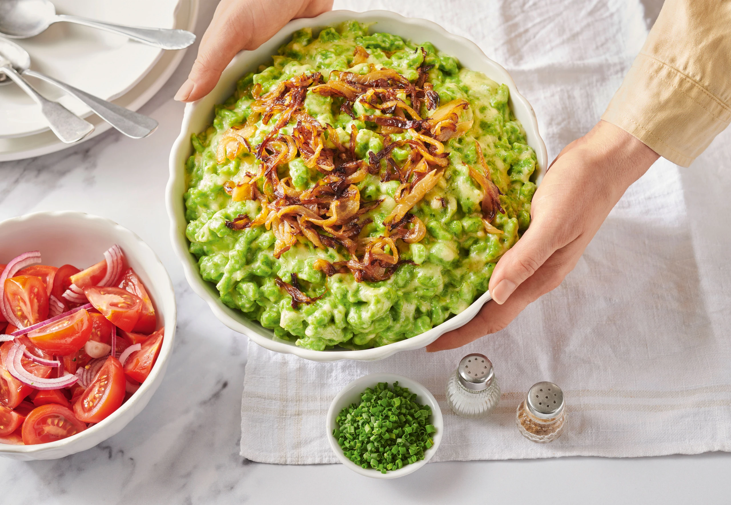 Spätzle mit Salz und Pfeffer würzen, mit den karamellisierten Zwiebeln bestreuen und mit Schnittlauch garnieren. Dazu passen am besten frische, leichte Salate.