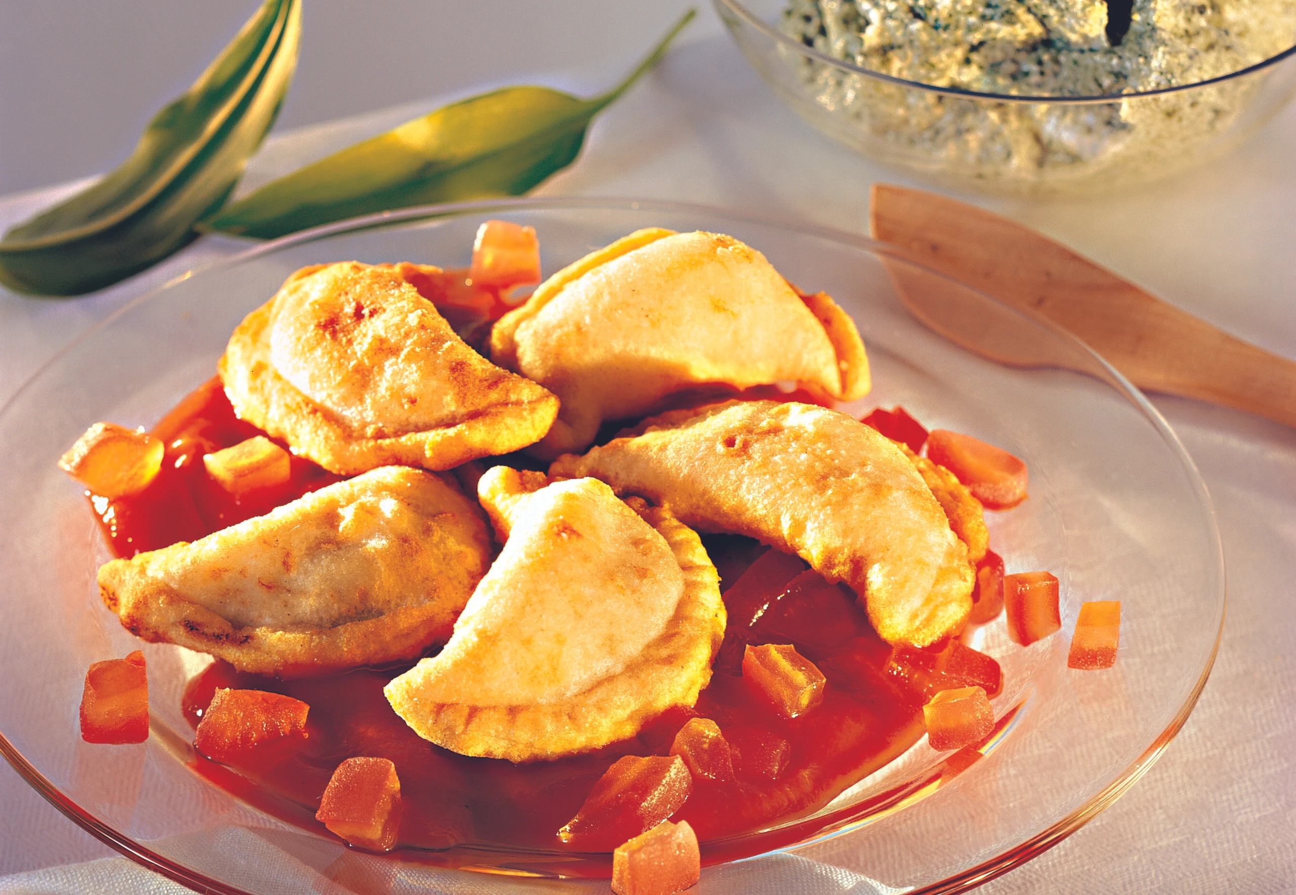Teig auf einer bemehlten Arbeitsfläche ausrollen und Scheiben (Ø ca. 9 cm) ausstechen. Scheiben mit Fülle belegen, Ränder mit verquirltem Ei bestreichen. Scheiben zusammenklappen und gut zusammendrücken; Kanten eventuell mit einer Gabel festdrücken.
