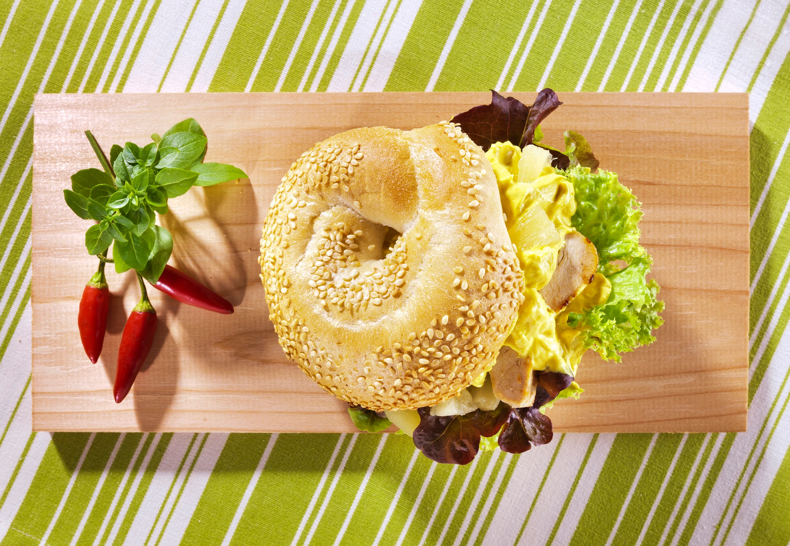 Bagels mit einem Sägemesser horizontal durchschneiden. Böden mit den Salatblättern be-legen, Aufstrich und Hühnerstücke darauf verteilen. Deckeln darauflegen und behutsam andrücken.