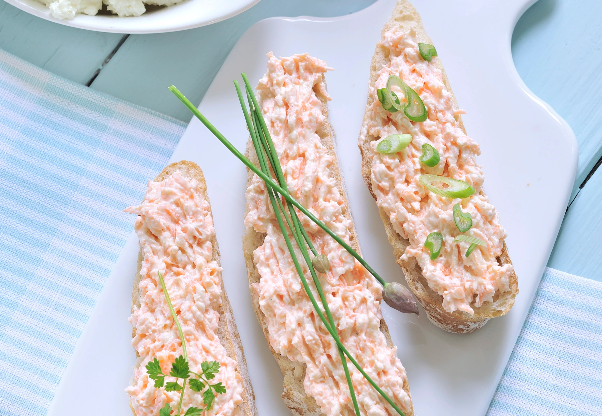 Baguette schräg in 12 Scheiben schneiden, mit dem Aufstrich bestreichen, mit Kerbel, Schnittlauch und Jungzwiebel garnieren.