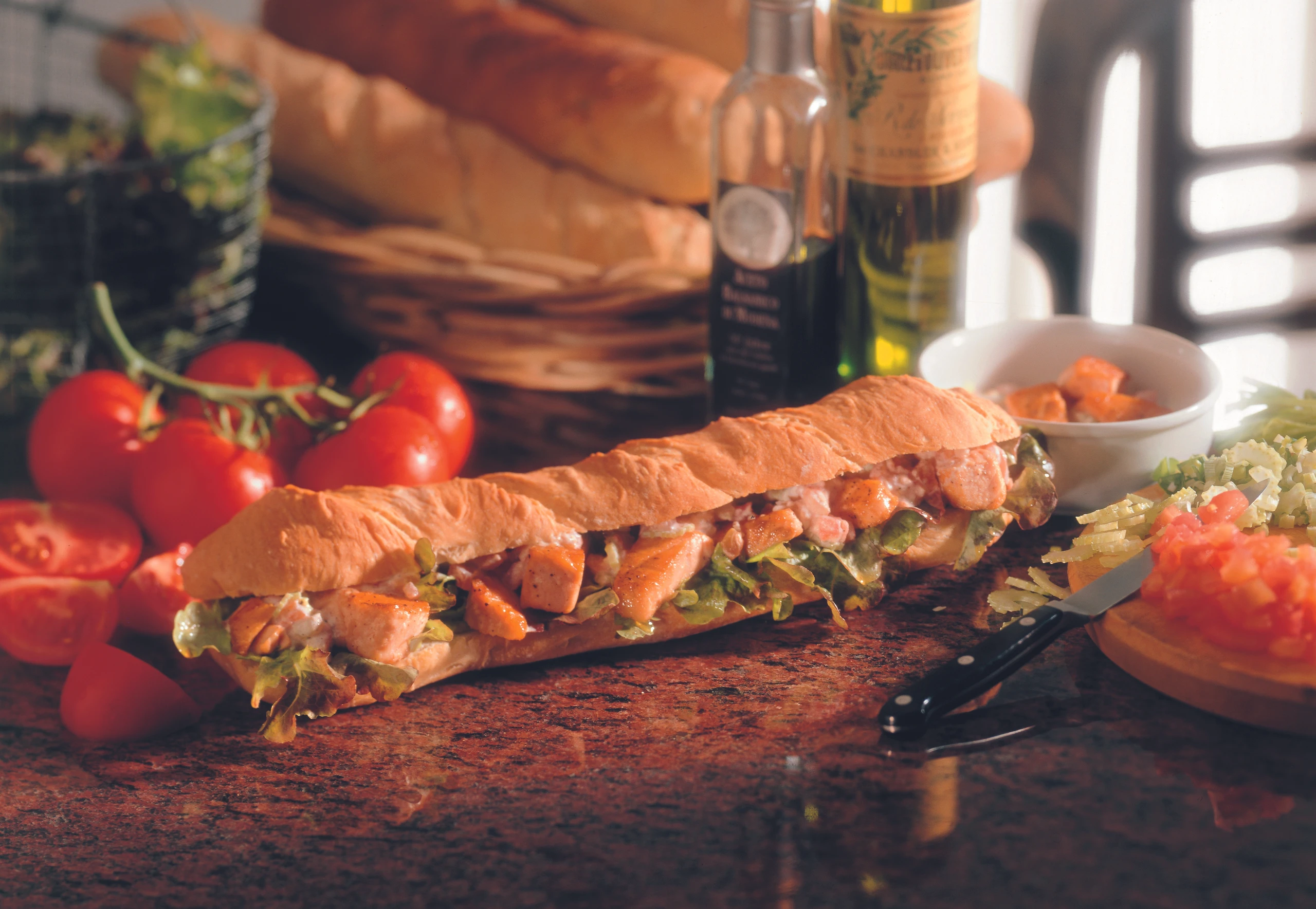 Das Baguette durchschneiden. Boden mit der Hälfte der Gemüsesauce bestreichen. Salatblätter darauf verteilen, mit wenig Zitronensaft und Olivenöl beträufeln und mit der restlichen Sauce bestreichen. Lachsstücke darauf verteilen, den Deckel darauflegen.