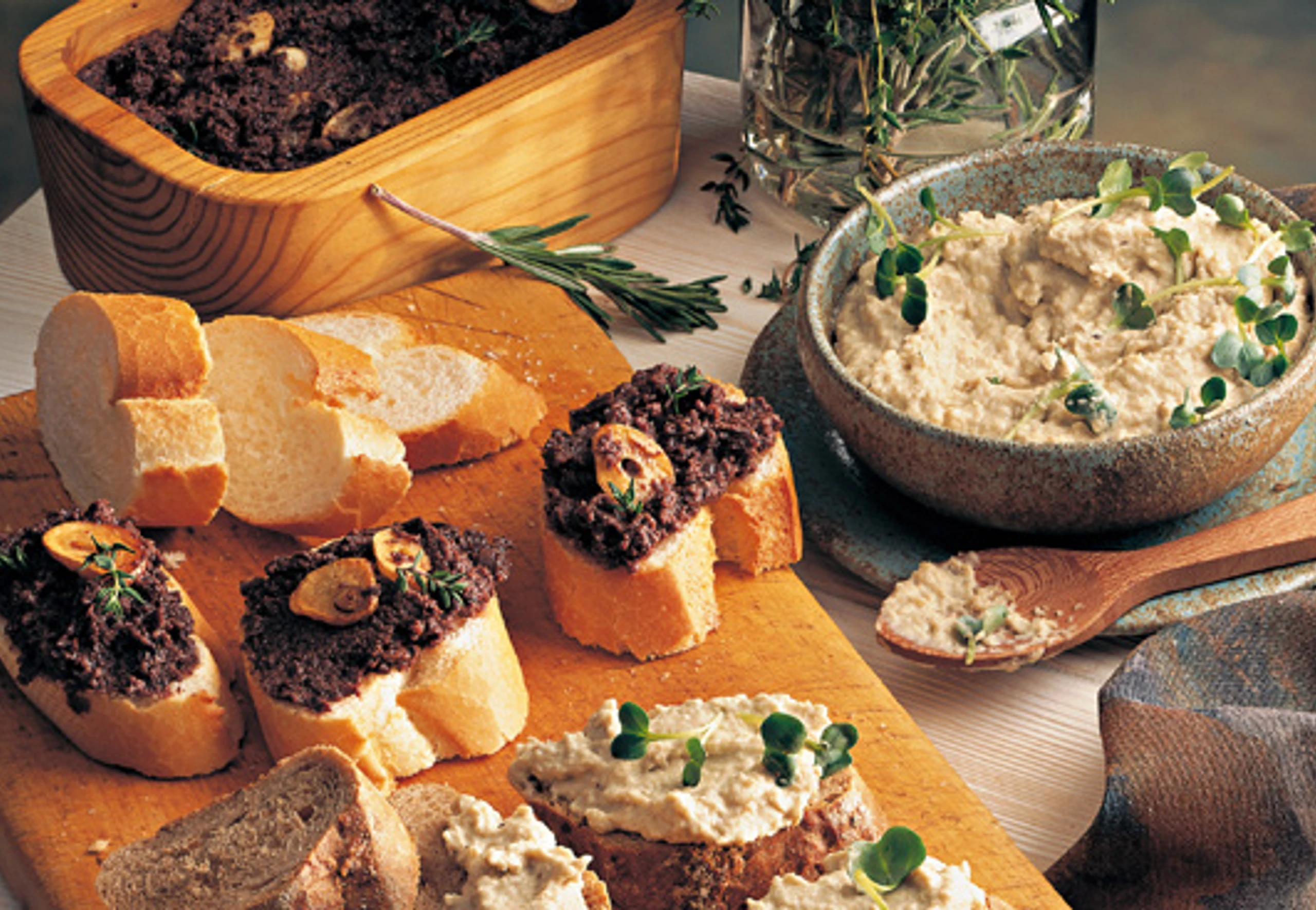 Baguettes mit Oliven-Aufstrich und Melanzani-Aufstrich