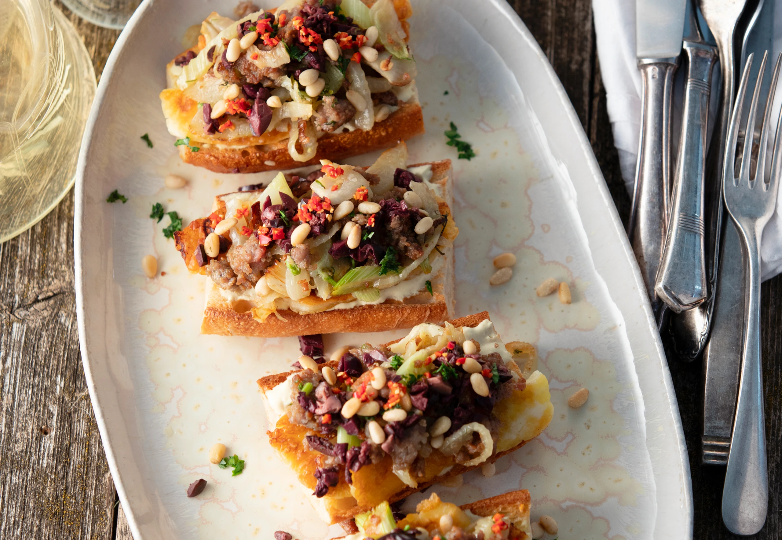 Baguette mit Salsiccia, Fenchel, Pignoli und Oliven