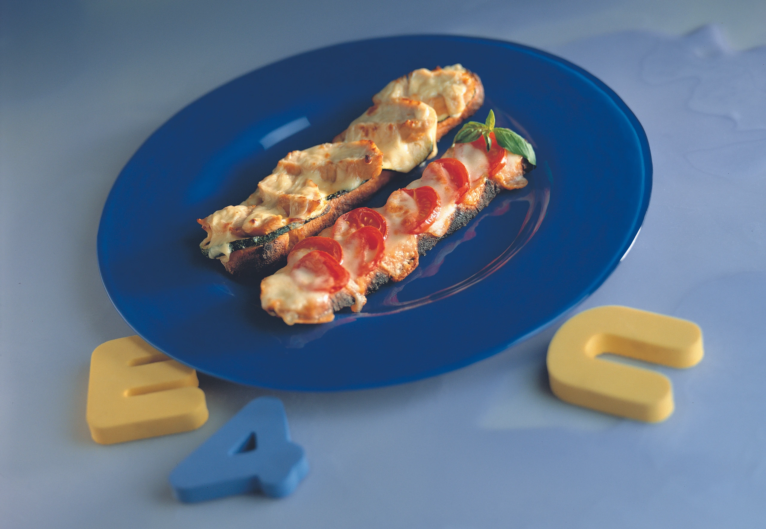 - Brote auf das Backblech legen, mit Paradeiser- und Mozzarellascheiben belegen, wenig salzen und im vorgeheizten Rohr (mittlere Schiene) knusprig überbacken. Brote mit Basilikumblättern garnieren.