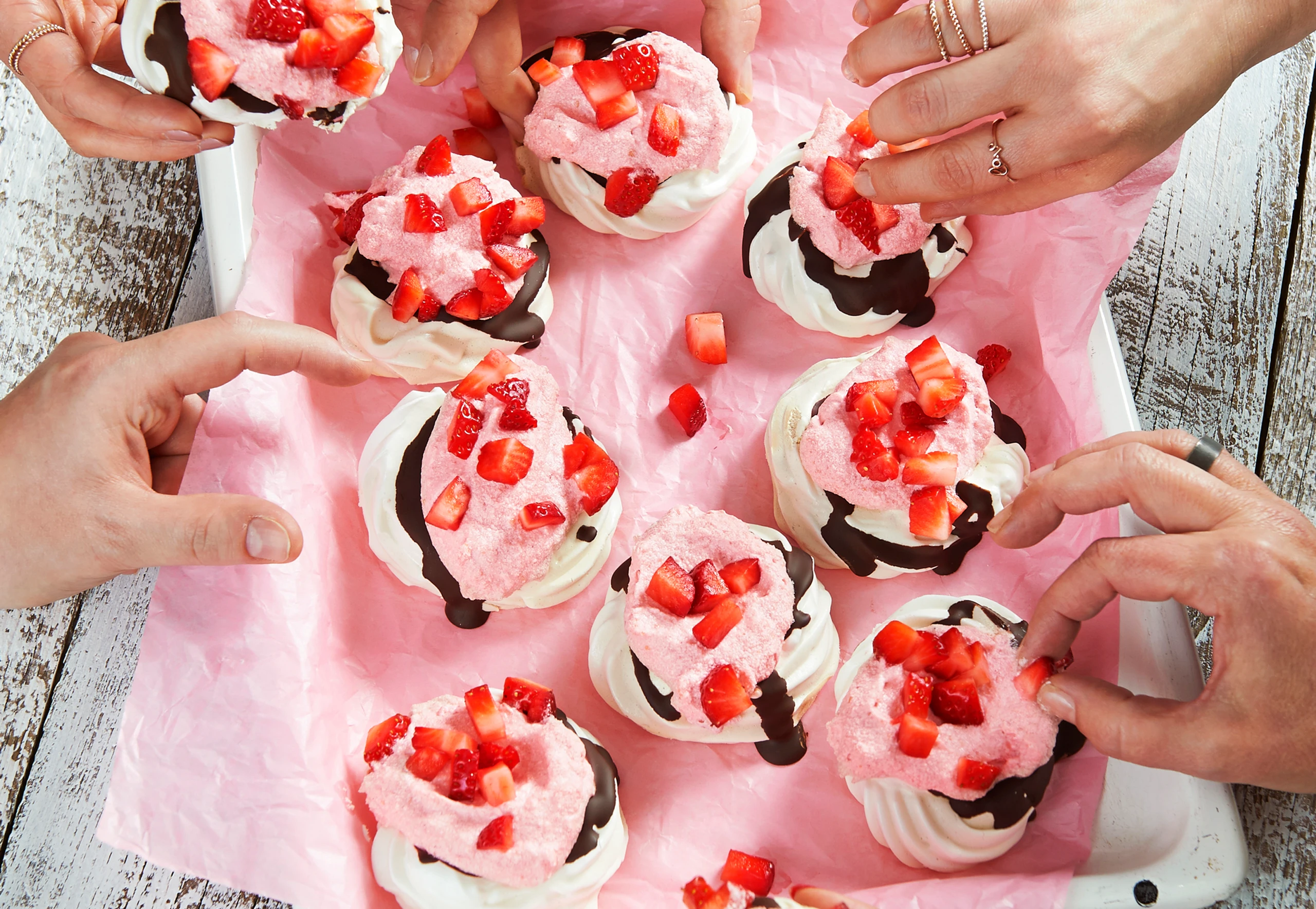 Für die Garnitur Erdbeeren putzen und in kleine Stücke schneiden. Creme auf den Baisers verteilen und mit Früchten garniert servieren.