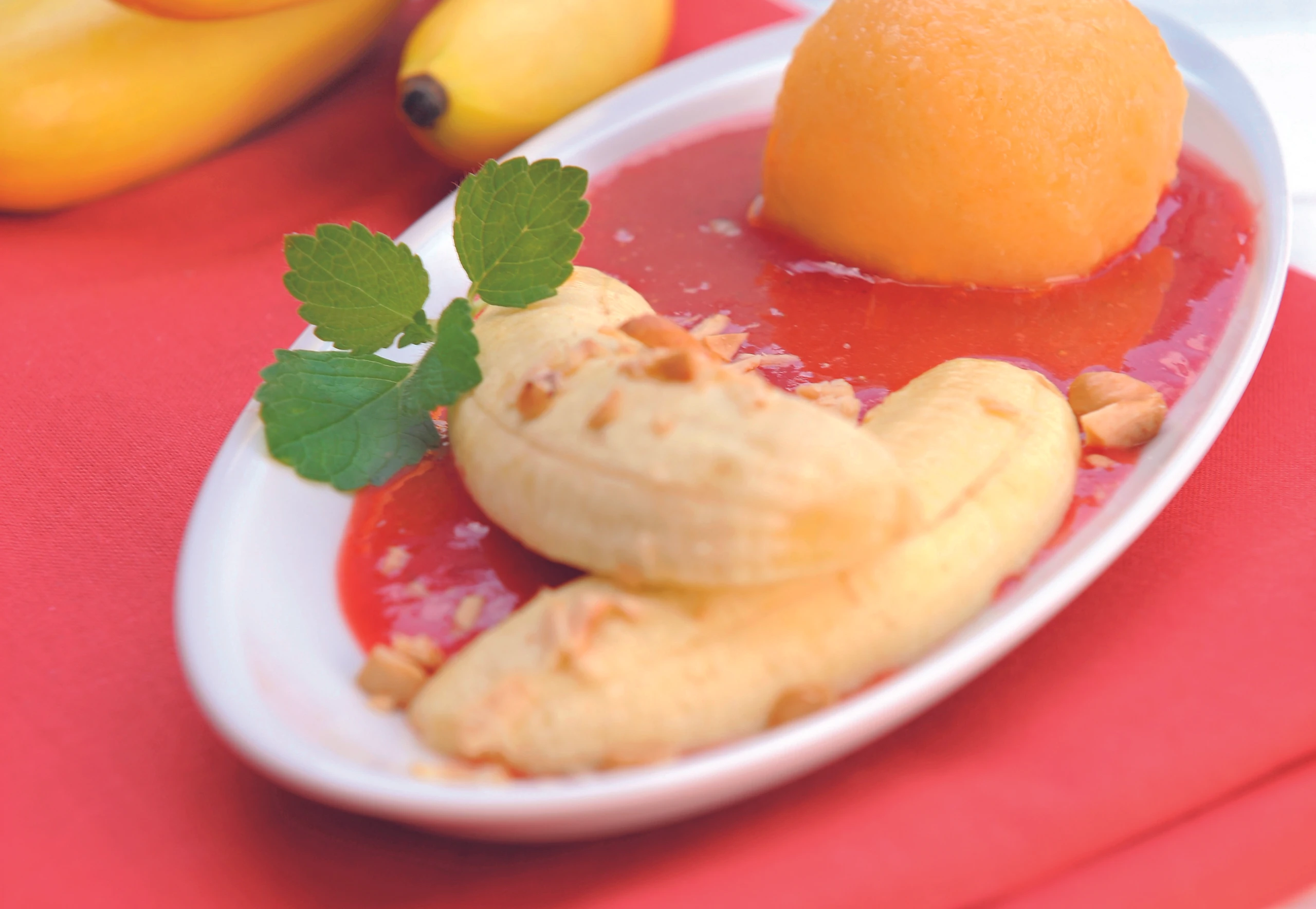Etwas Erdbeersauce auf Tellern verteilen, Bananen darauflegen. Aus der Orangen-Rahm-Masse Kugeln ausstechen und daraufsetzen.
