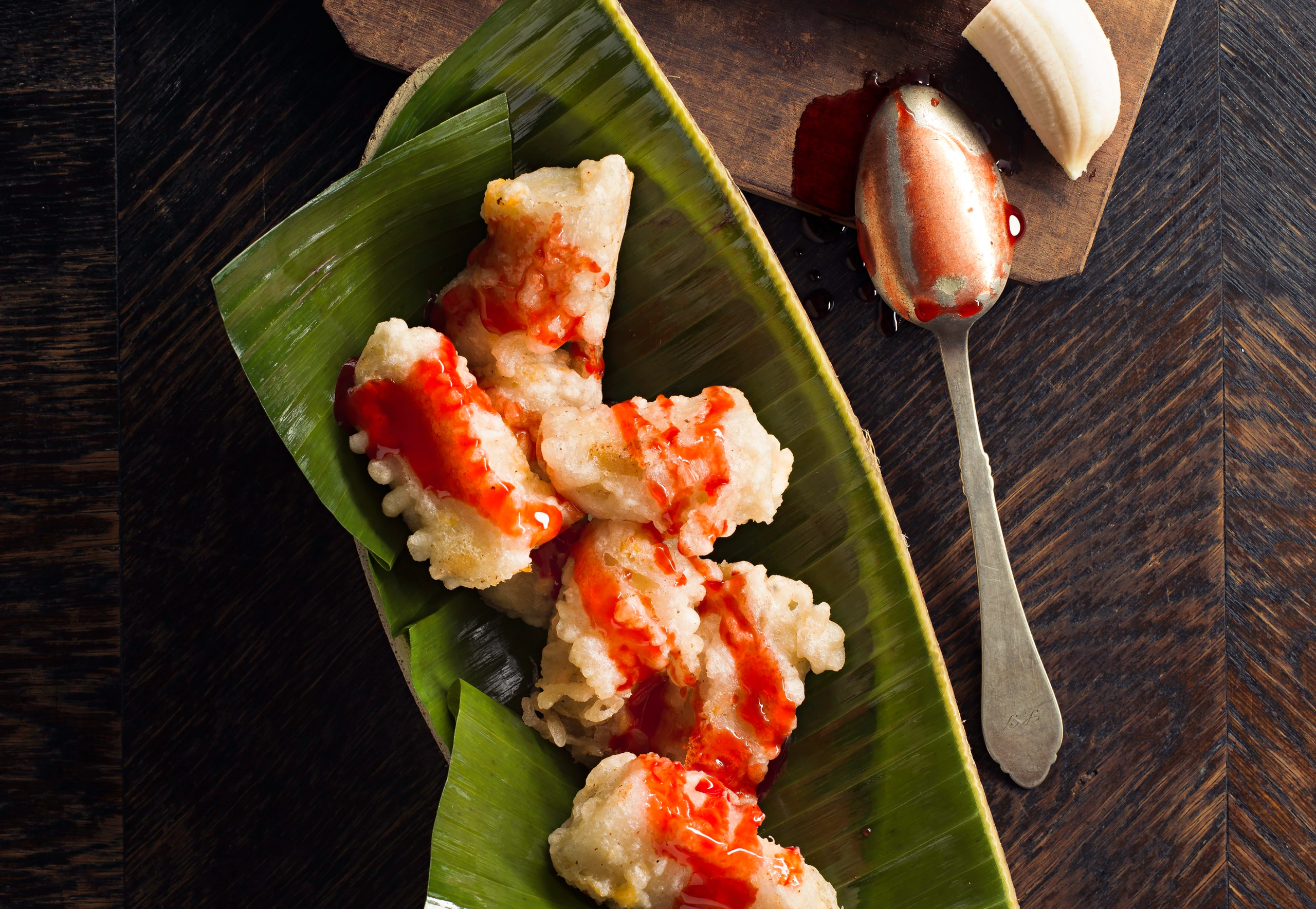 - Bananen schälen und in ca. 3 cm große Stücke schneiden. 3 Finger hoch Öl auf ca. 160°C erhitzen. Bananen in den Backteig tauchen, abtropfen lassen und im Öl goldbraun backen (ca. 3 Minuten).