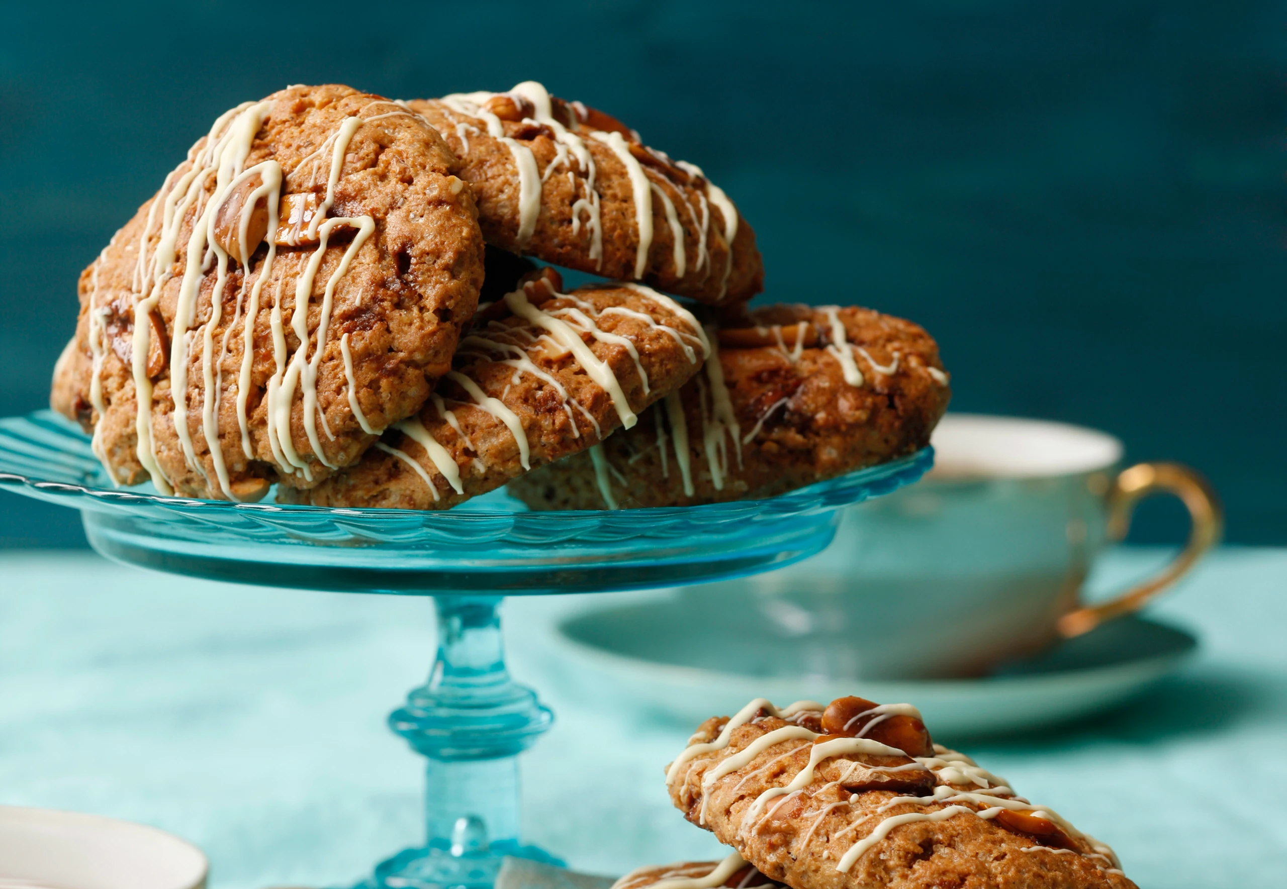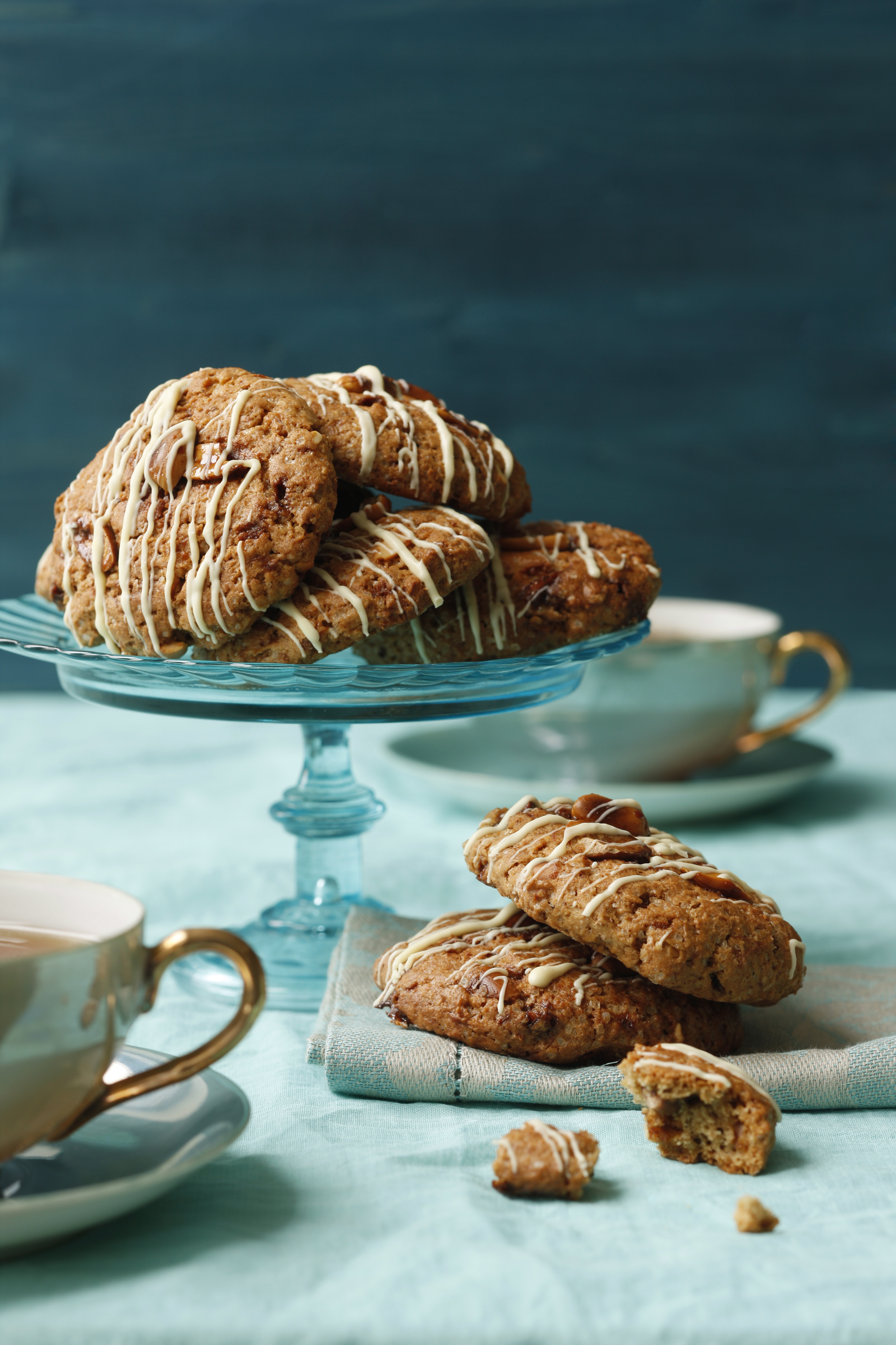 Weiße Kuvertüre grob hacken und im Wasserbad schmelzen. Cookies mit Kuvertüre verzieren.