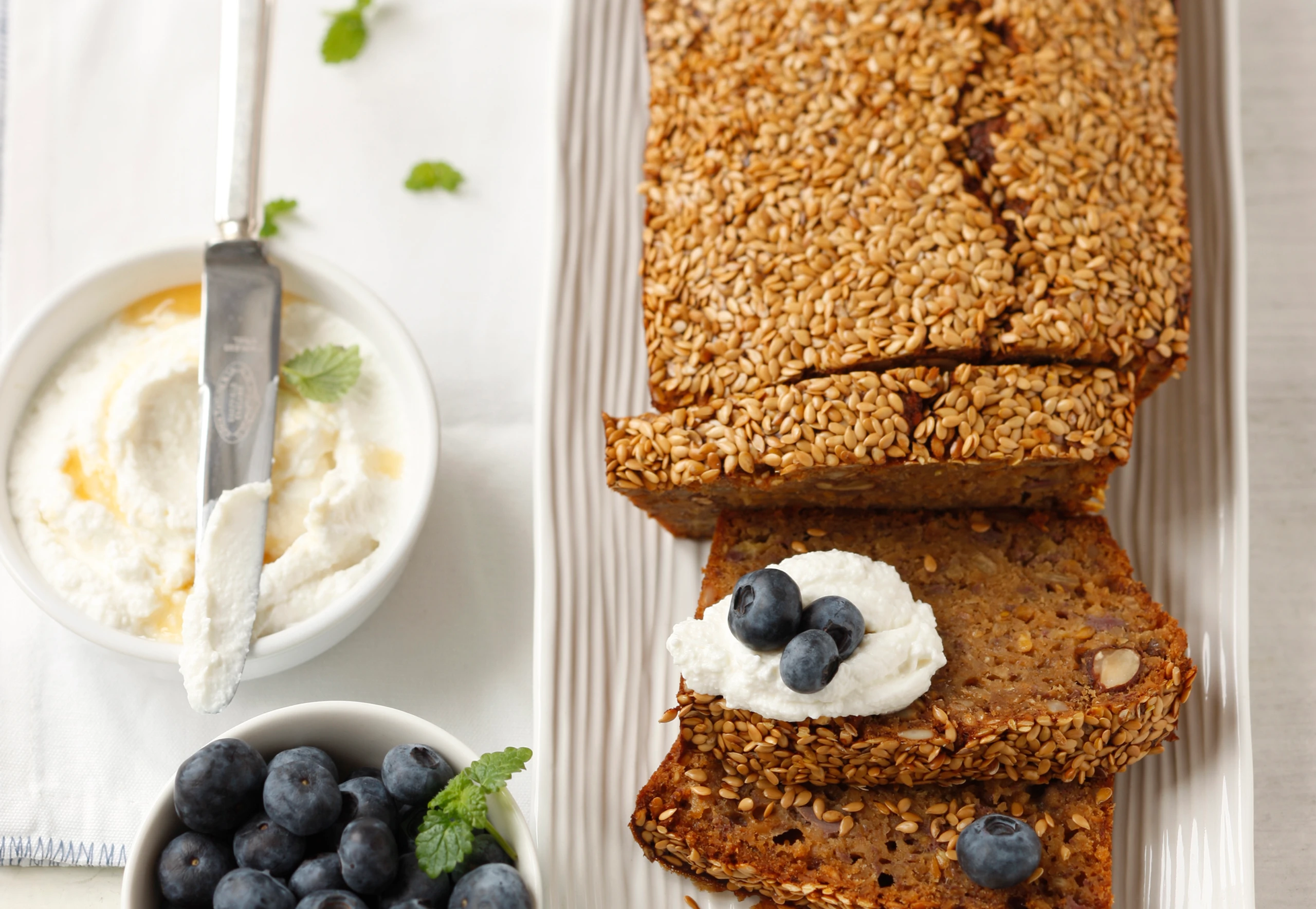 Rohr auf 160°C vorheizen. Kastenform (Inhalt 1,2 l) mit Backpapier auslegen und mit Leinsamen ausstreuen.