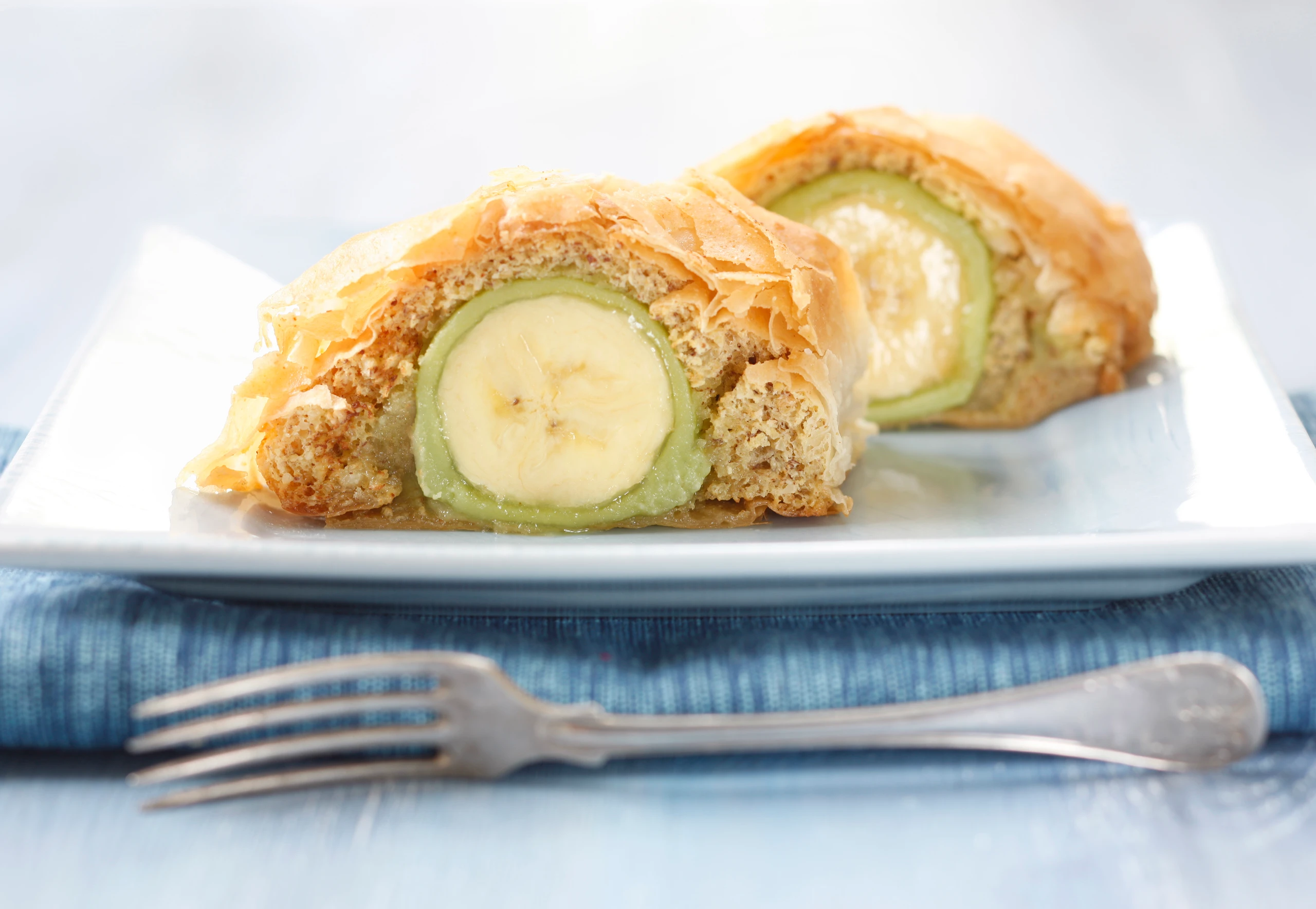 - Ein Strudelblatt auf ein befeuchtetes Geschirrtuch legen und mit Butter bestreichen. Zweites Blatt darauflegen und ebenfalls mit Butter bestreichen. Teig längs halbieren. Teighälften am unteren Rand mit je einem Viertel der Mandelmasse bestreichen und mit einem Bananenpäckchen belegen. Seitliche Teigränder einschlagen, Päckchen im Teig einrollen und auf das Blech legen. Diesen Vorgang mit dem restlichen Teig und den übrigen Zutaten wiederholen. Päckchen im Rohr (mittlere Schiene) 25?30 Minuten backen. Päckchen aus dem Rohr nehmen, quer halbieren und mit Staubzucker bestreut servieren.