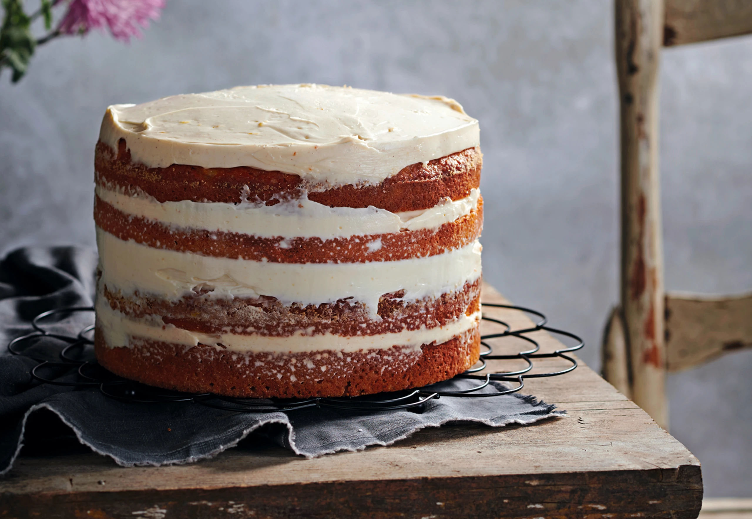 Für die Creme Frischkäse, Zucker und Zimt cremig mixen. Zitronenschale untermischen. Einen Tortenboden mit ca. 3 EL der Creme bestreichen. Zweiten Boden darauf legen und vorsichtig mit Creme bestreichen. Wiederholen und mit dem vierten Tortenboden abschließen. Eine Teigkarte an der Torte ansetzen und rundherum ziehen, um die herausquellende Creme zu verstreichen.