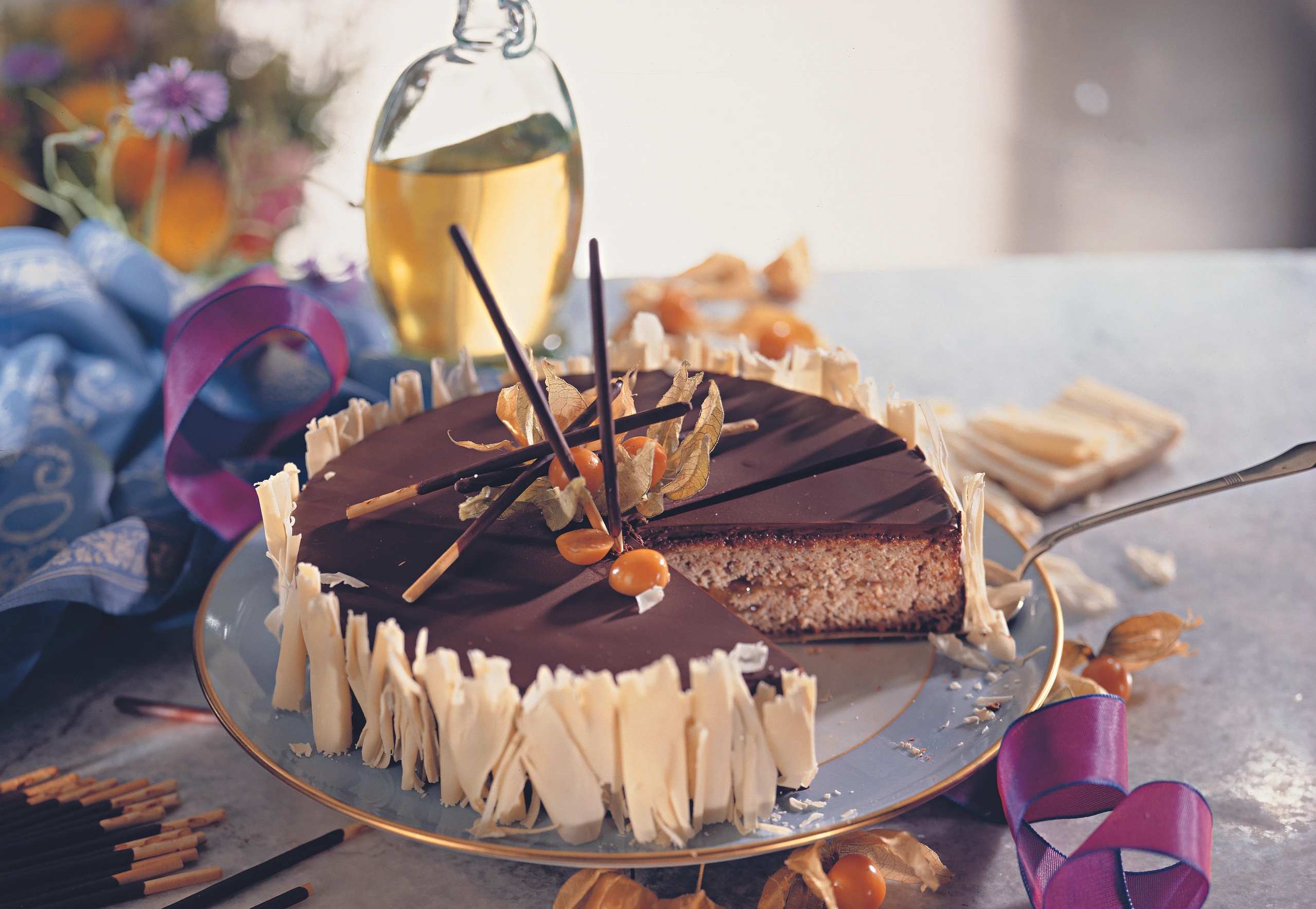 Für die Garnitur Schalen der Erdkirschen öffnen und nach oben ziehen. Torte mit Schokoladestäbchen und Erdkirschen garnieren.