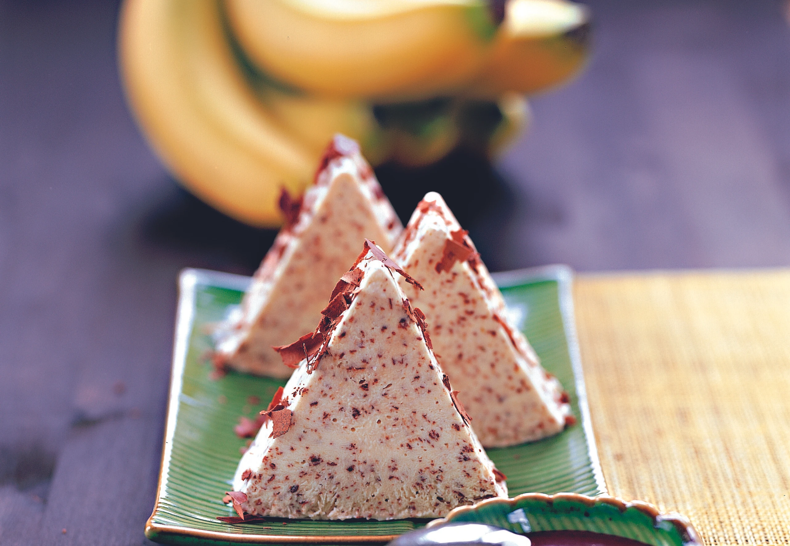 Eine Terrinenform (Inhalt ca. 1,2 l) mit kaltem Wasser ausspülen und mit Frischhaltefolie auslegen. Bananen schälen, zerkleinern, mit Milch, Honig, Kristallzucker und Zitronensaft vermischen und fein pürieren.