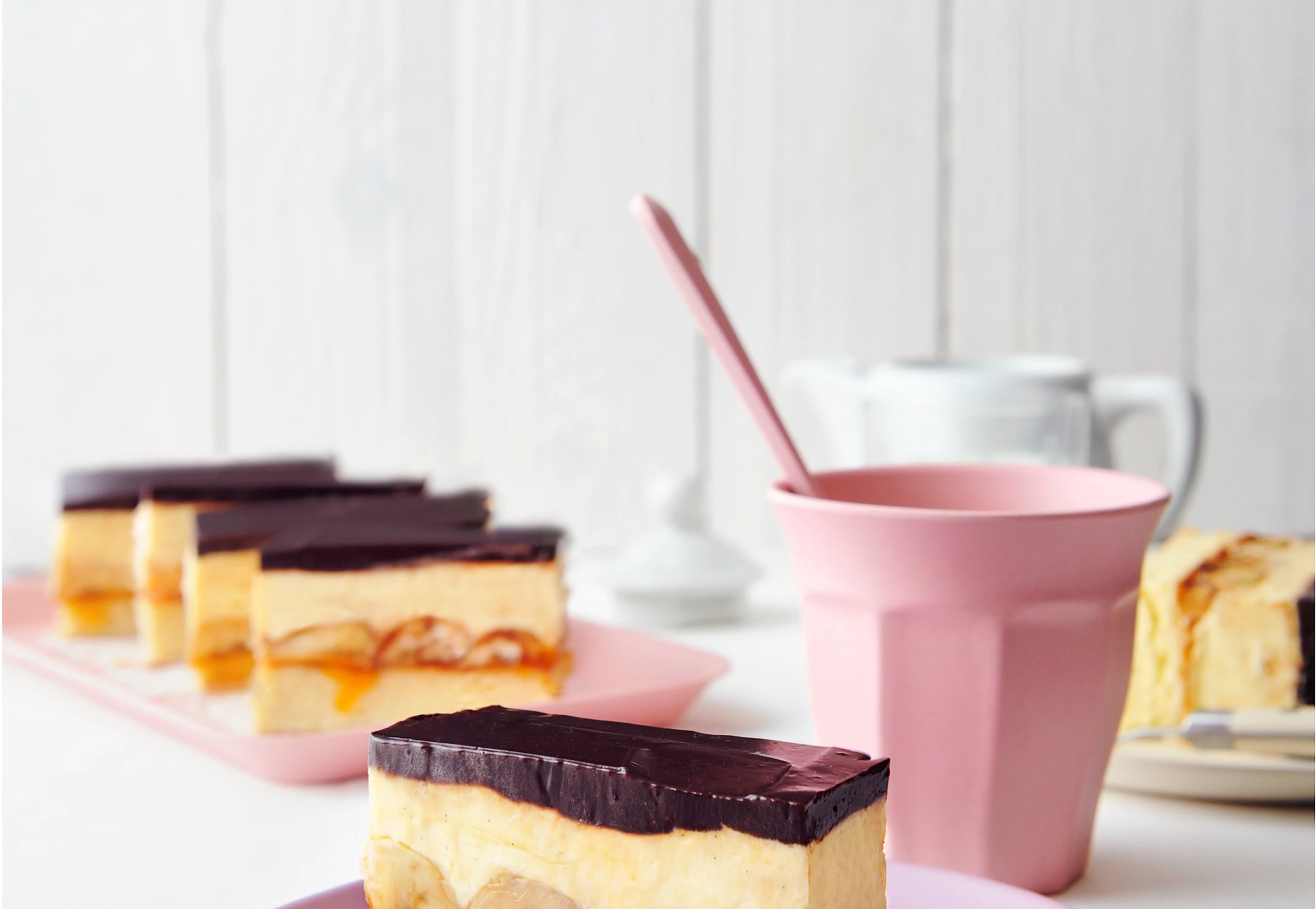 Für den Boden Rohr auf 180°C vorheizen. Backblech mit Backpapier belegen und eine Rahmenform (26 x 19 cm) darauf stellen. Eier trennen. Dotter mit 50 g vom Zucker 5 Minuten schaumig mixen. Eiklar mit restlichem Zucker zu cremigem Schnee schlagen. Schnee unter die Dottermasse heben. Mehl und Stärke sieben und unterrühren. Masse in der Form verstreichen und im Rohr (mittlere Schiene) ca. 20 Minuten hell backen. Herausnehmen und auskühlen lassen.