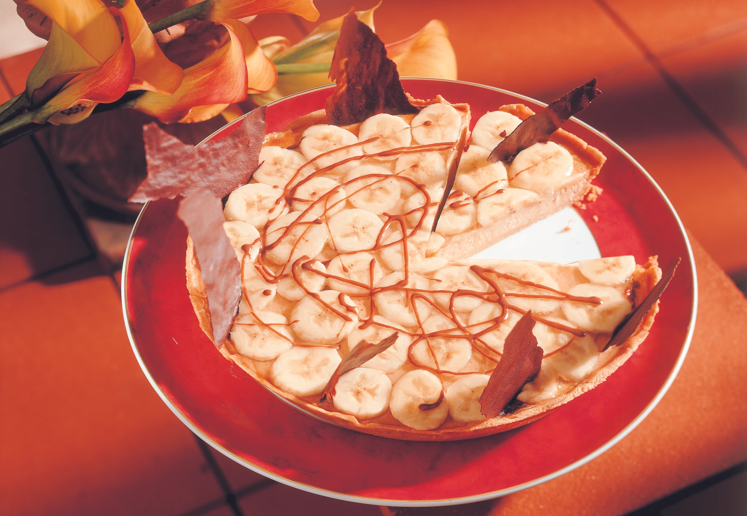 Tortengelee nach Anleitung zubereiten und gleichmäßig über die Bananen gießen. Schokolade in kleine Stücke brechen, über Wasserdampf schmelzen, in ein Papierstanitzel füllen. Torte mit Schokolade und Kakaoblättern garnieren.