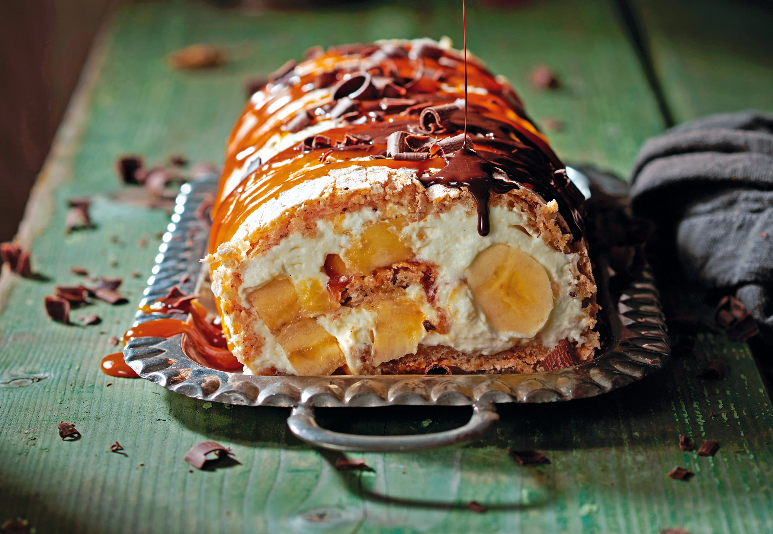 Für die Fülle Obers und Vanille cremig mixen. Bananen schälen und in Scheiben schneiden. Meringue vorsichtig aufrollen, mit dem Obers bestreichen und mit den Bananenscheiben belegen. Mit drei Viertel vom Karamell beträufeln. Meringue einrollen. Mit Kuvertüre und übrigem Karamell beträufeln und mit Schokospänen bestreuen.