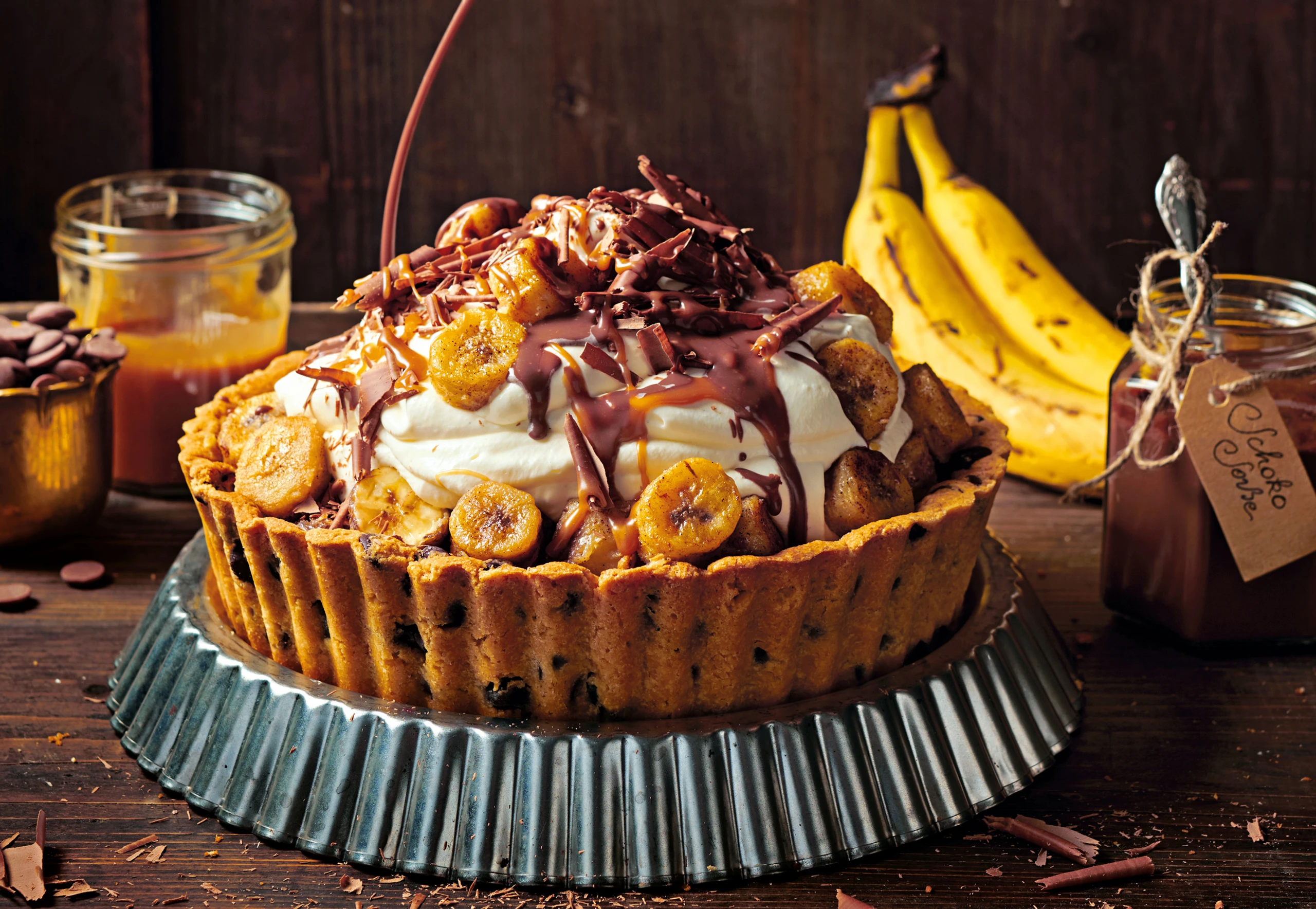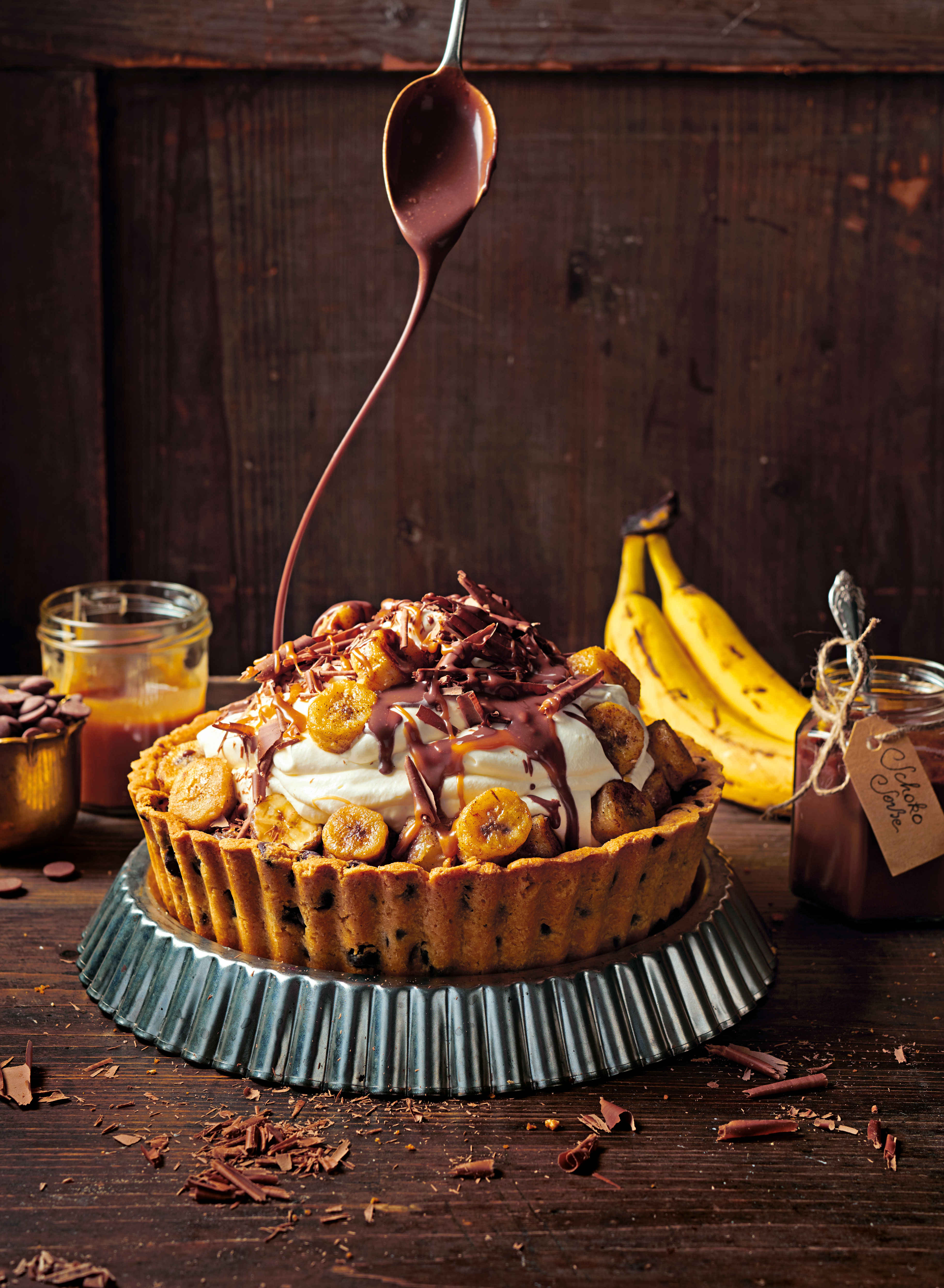 Drei Viertel der Bananen auf dem Dule de leche verteilen. Obers darauf verstreichen. Mit den übrigen Bananen belegen. Mit Schokosplittern bestreuen und mit Karamell- und Schokosauce beträufeln.