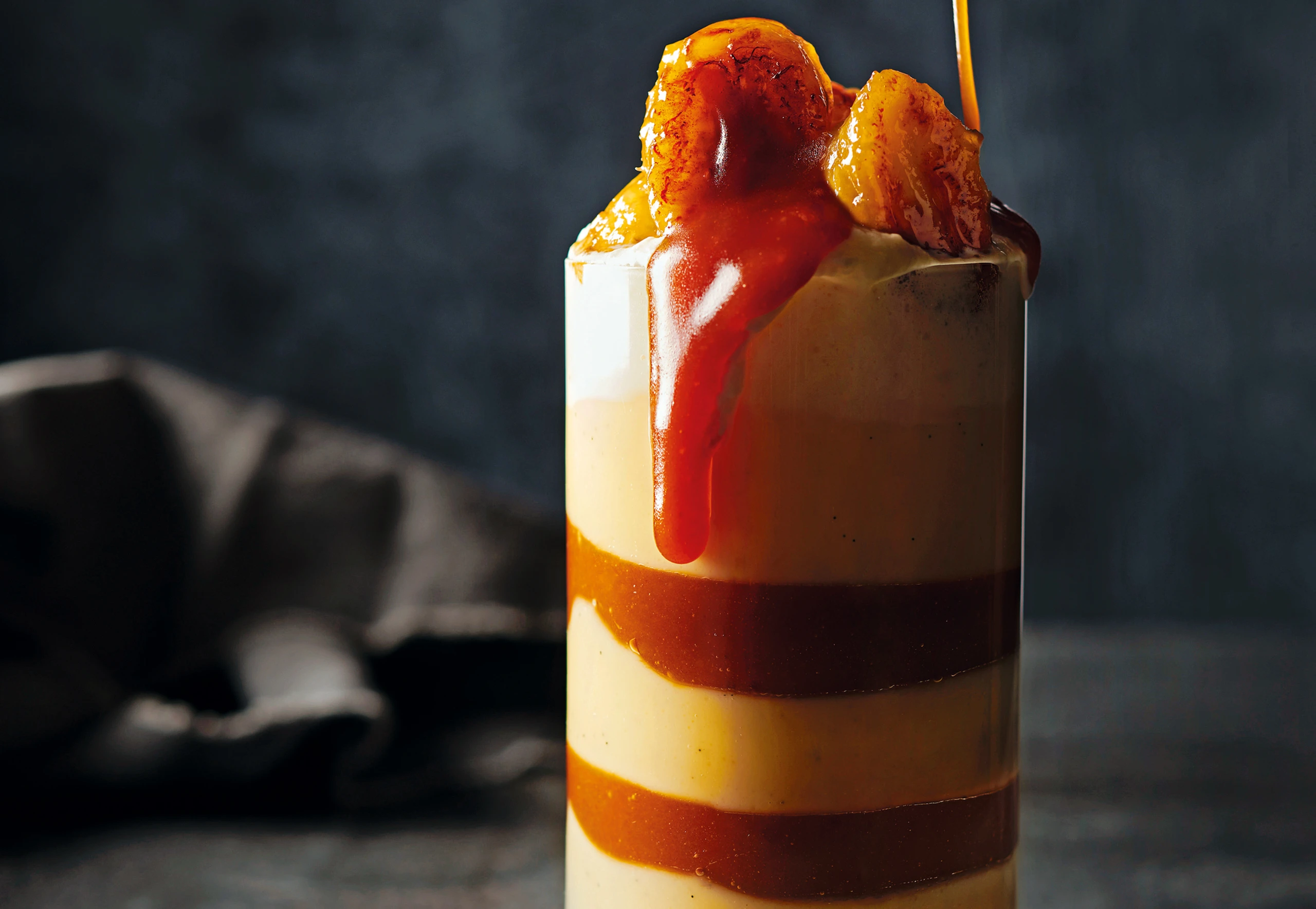 Konditorcreme und Karamell abwechseln in Gläser füllen. Mit Bananen auffüllen und mit übrigem Karamell beträufeln.