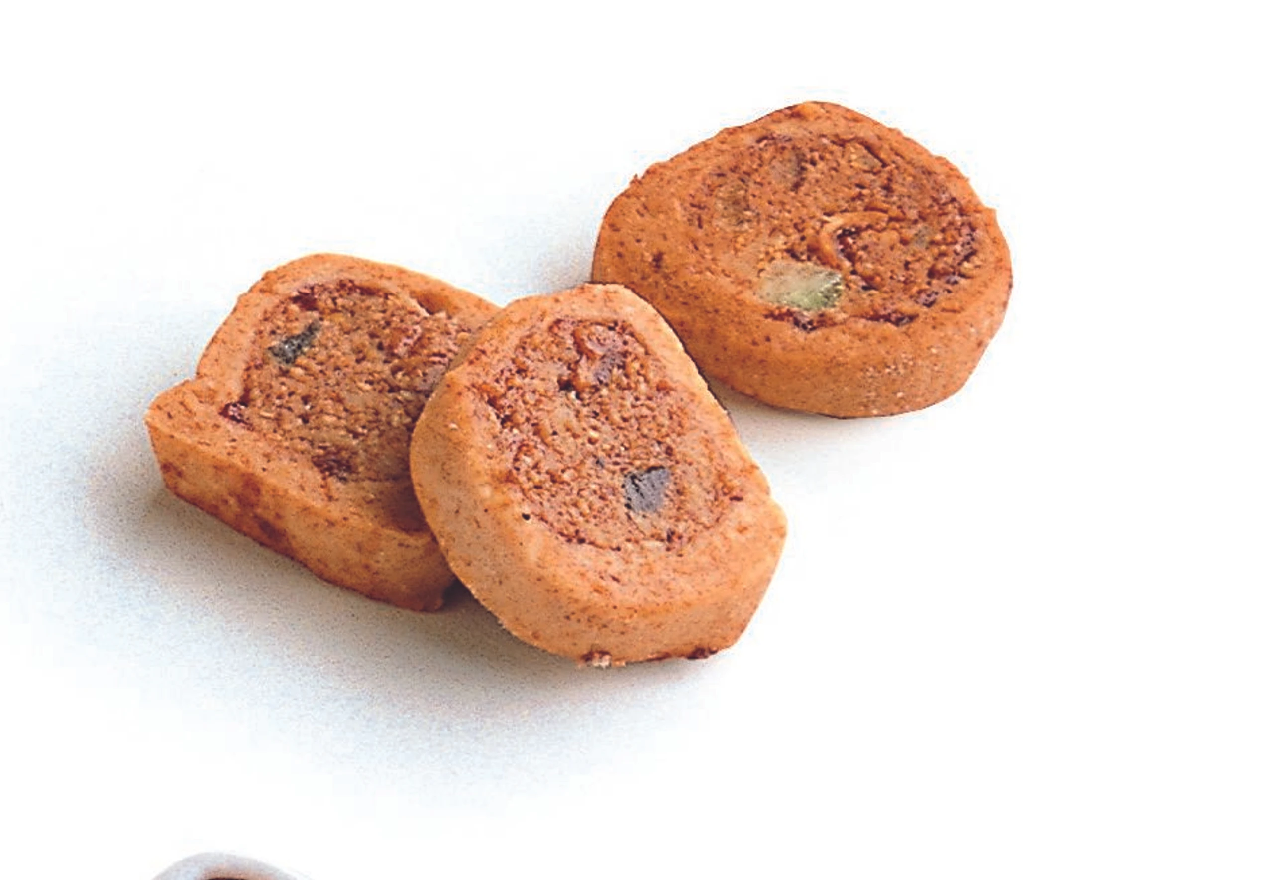 Teig 4 mm dick (37 x 14 cm) ausrollen und mit Milch bestreichen. Fülle am unteren Rand auflegen und fest im Teig einrollen. Rolle ca. 30 Minuten tiefkühlen. Rohr auf 180 °C vorheizen. 3 Backbleche mit Backpapier belegen.