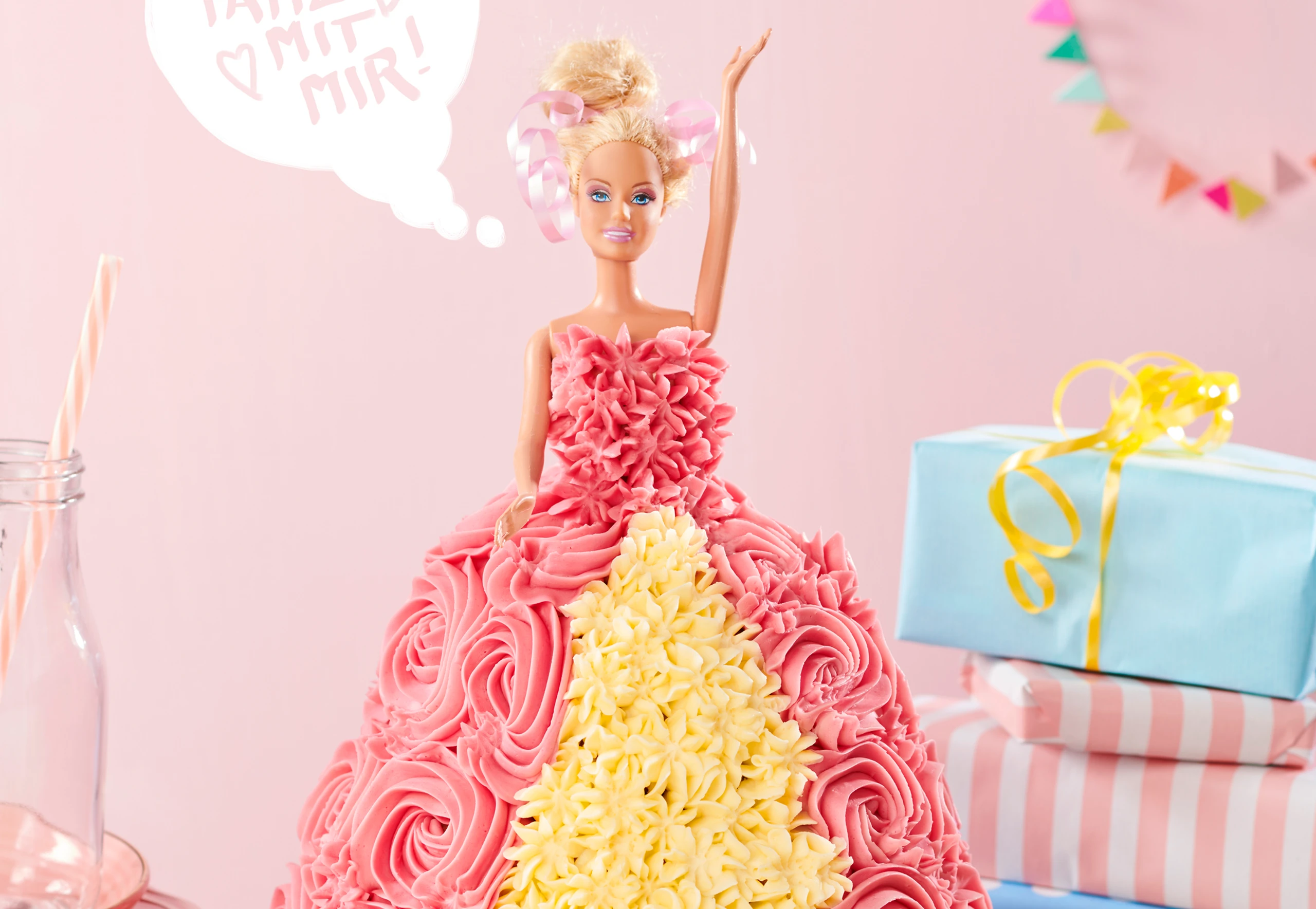Übrige Creme mit pinker Lebensmittelfarbenpaste einfärben und in einen Dressiersack mit großer Sterntülle füllen. Große Rosetten als Kleid aufdressieren, danach den Oberkörper der Puppe mit restlicher Creme verzieren.