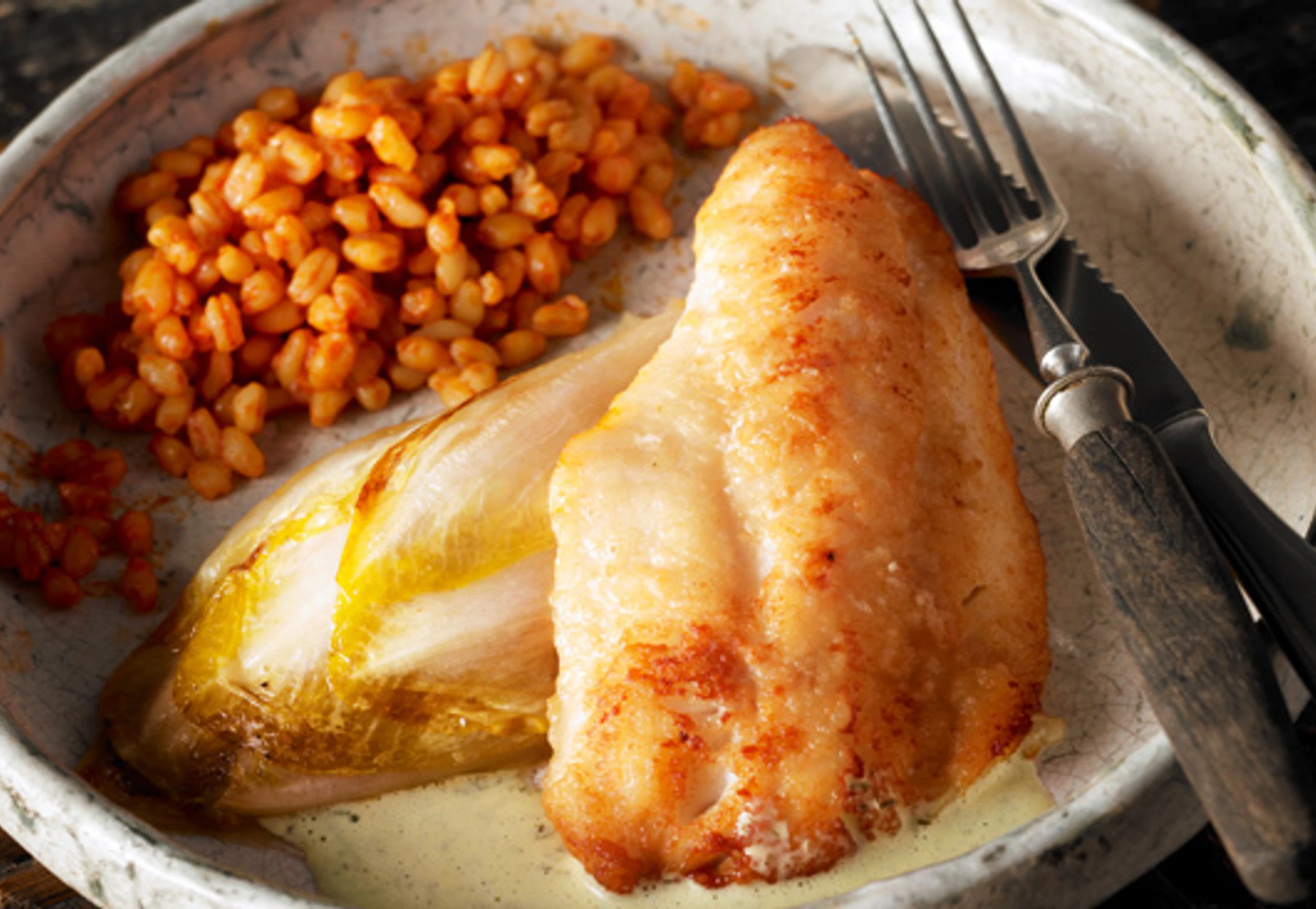 - Dille in die Sauce rühren, Sauce pürieren. Filets mit Chicorée, Sauce und Weizenreis anrichten.