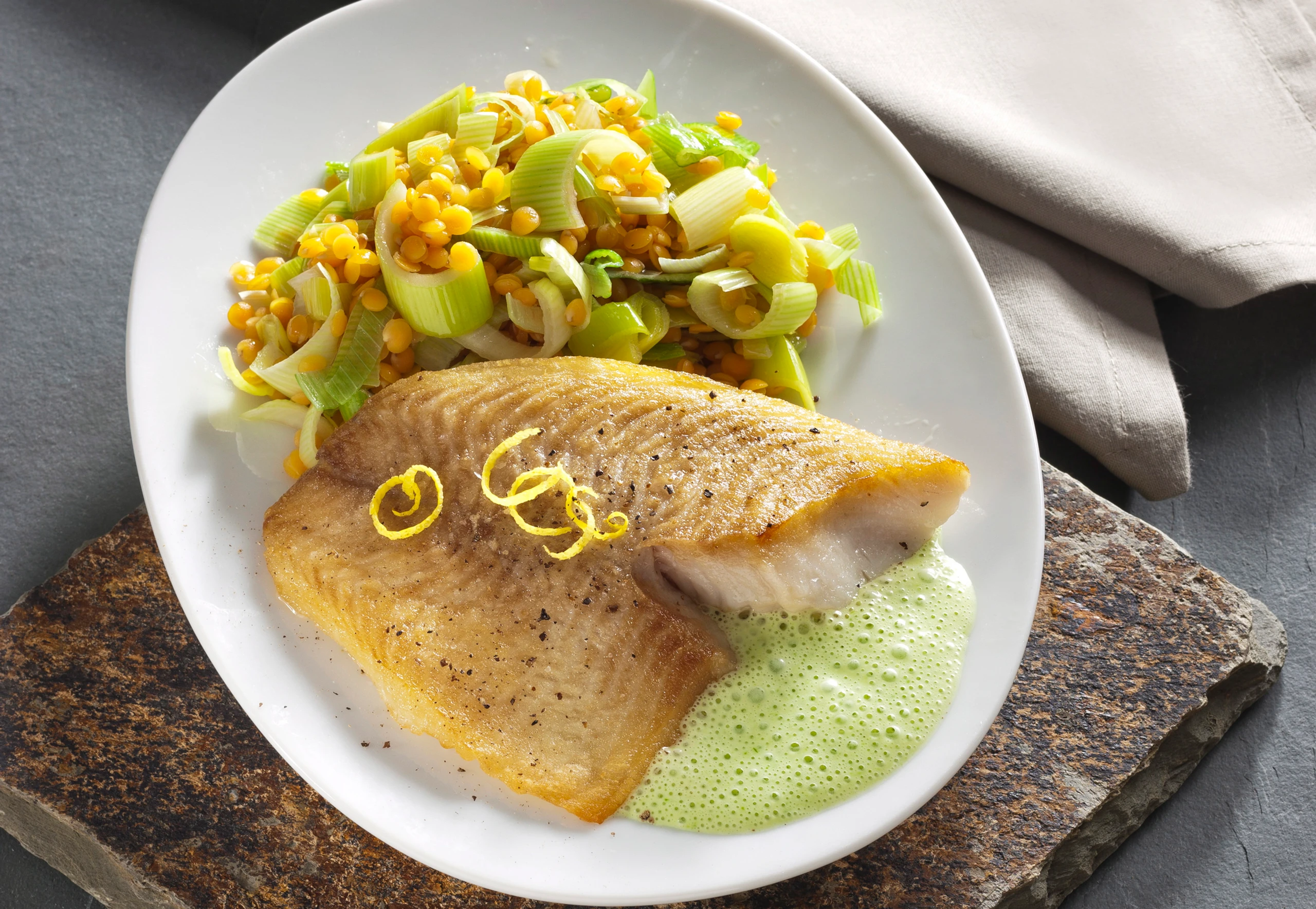 - Kresse in die Sauce rühren. Sauce mit Salz, Pfeffer und Zitronensaft würzen und pürieren. Fischfilets mit Sauce und Gemüse anrichten.