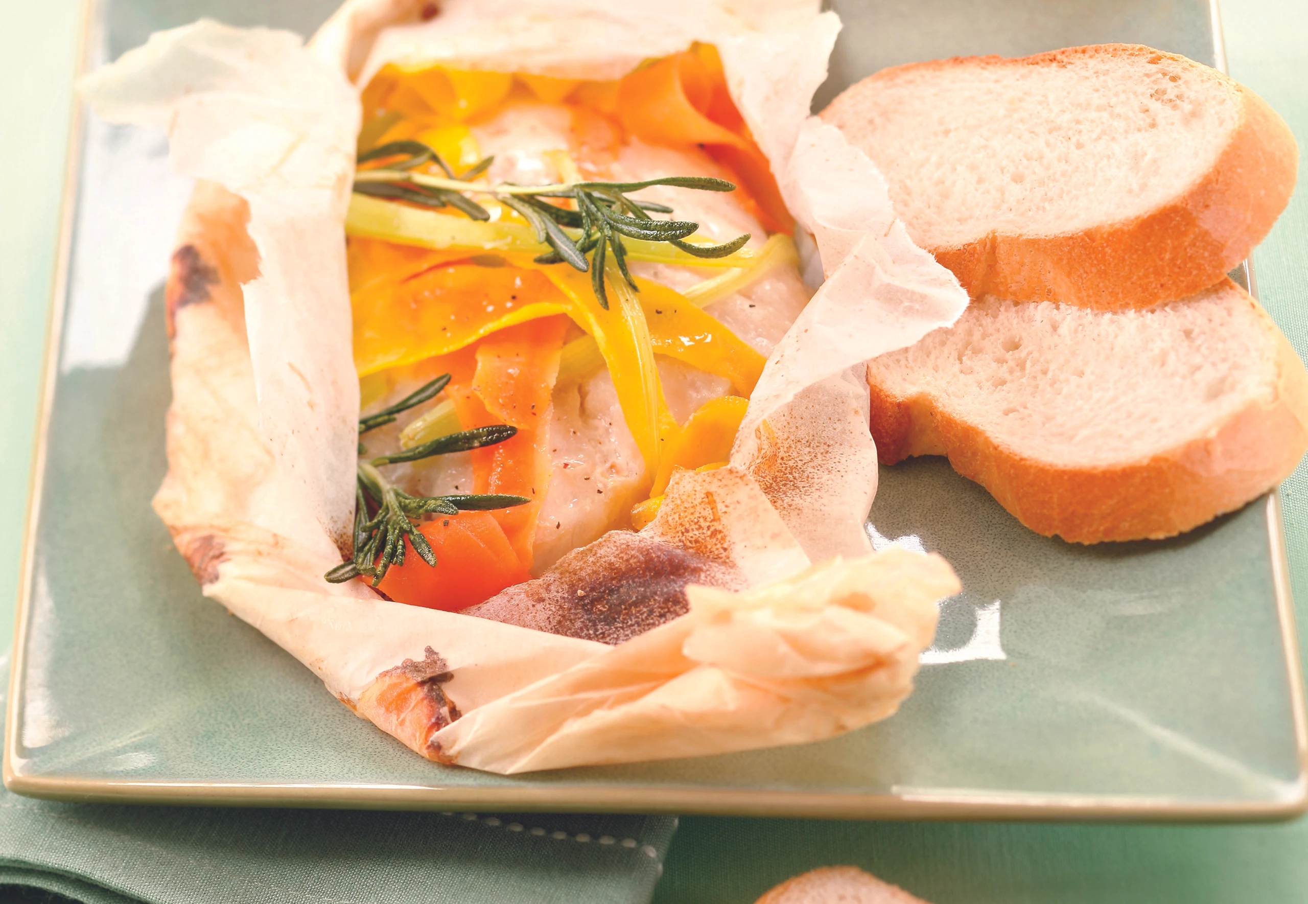 - Päckchen auf ein Backblech legen, mit Butter bestreichen und im Rohr (mittlere Schiene) ca. 20 Minuten backen. Fisch mit Weißbrot servieren.