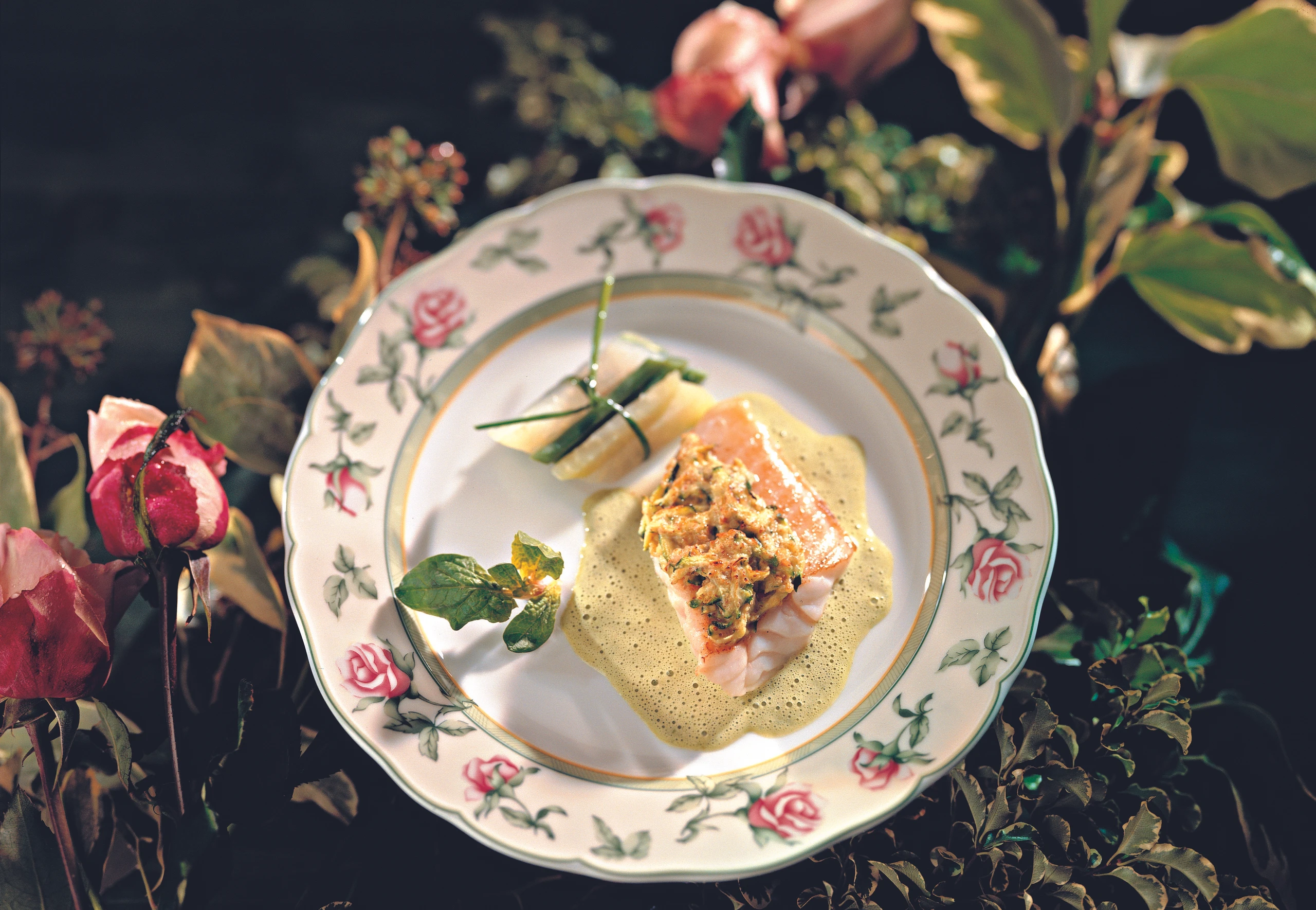Barschfilet mit Zucchini-Mandelkruste und Spinatsauce