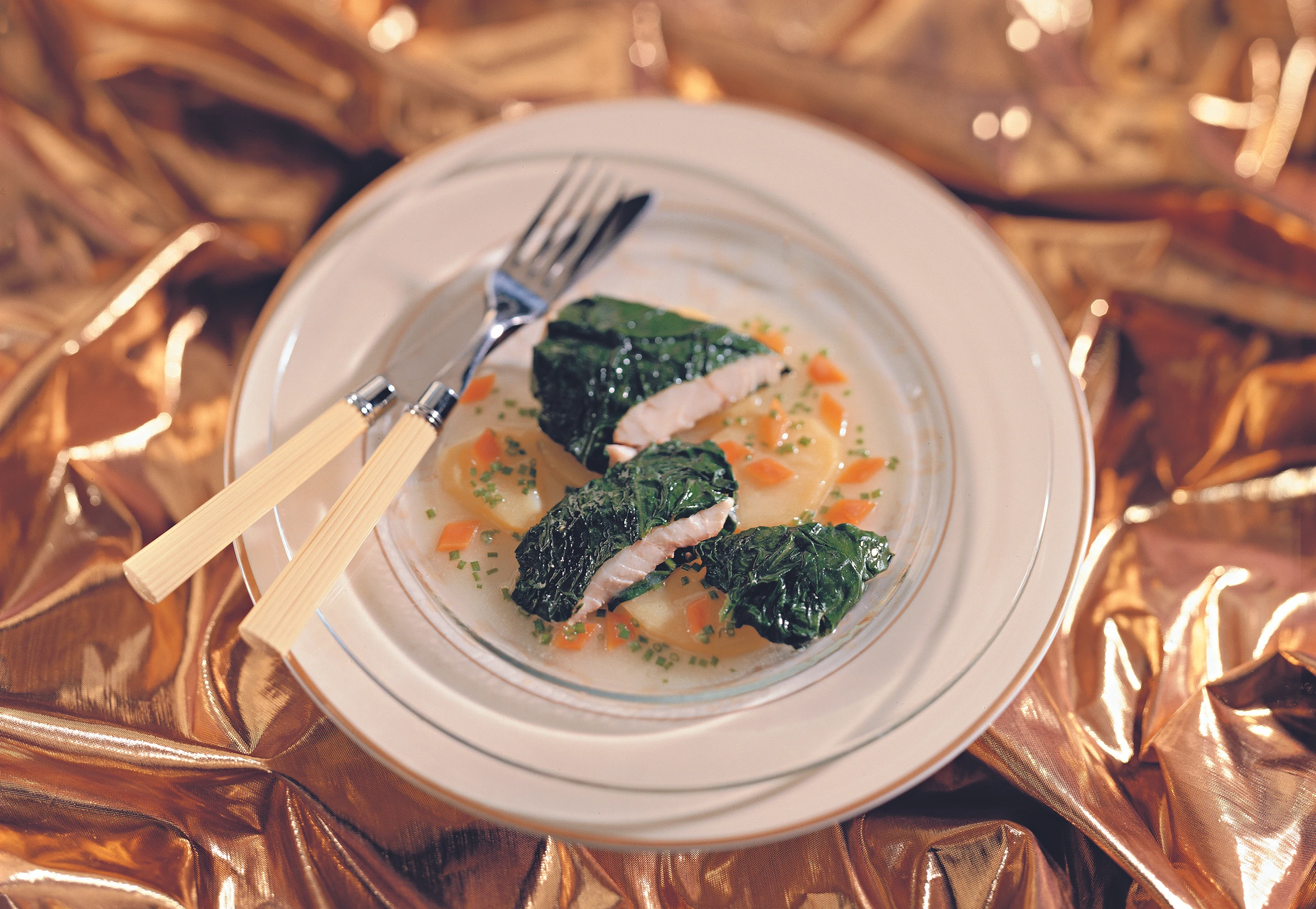 Barschfilet im Spinatblatt mit Wurzelfond