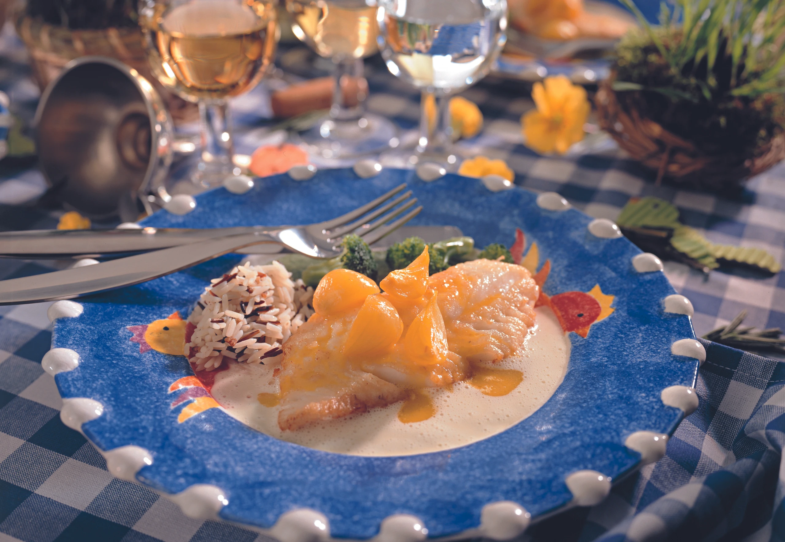 Weinsauce mit einem Stabmixer aufschlagen. Fischfilets mit Sauce und Safranzwiebeln anrichten. Als Beilagen passen Brokkoli und gemischter Reis.