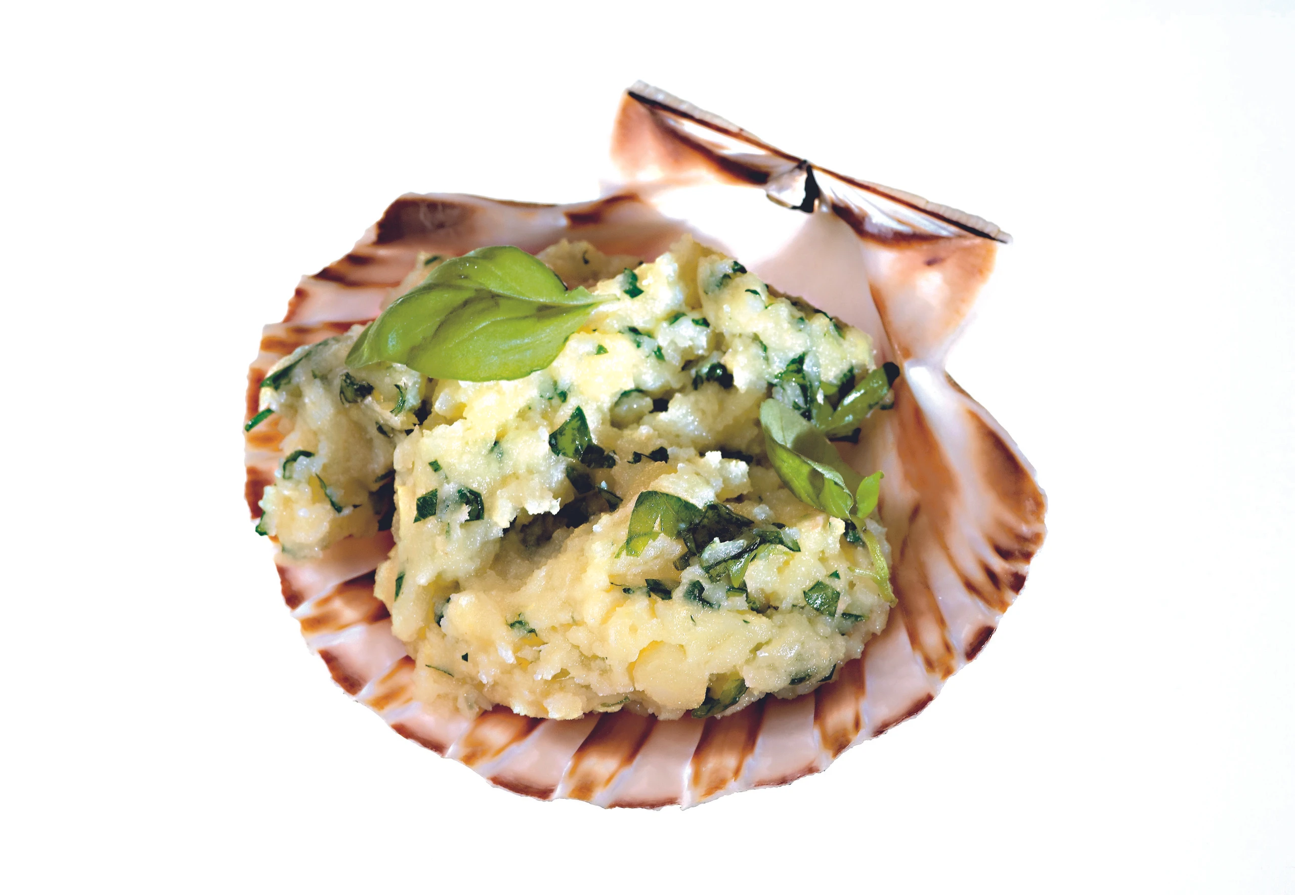 - Basilikum fein schneiden. Erdapfel und Basilikum mit der Knoblauchcreme vermischen. Aioli mit Salz abschmecken.