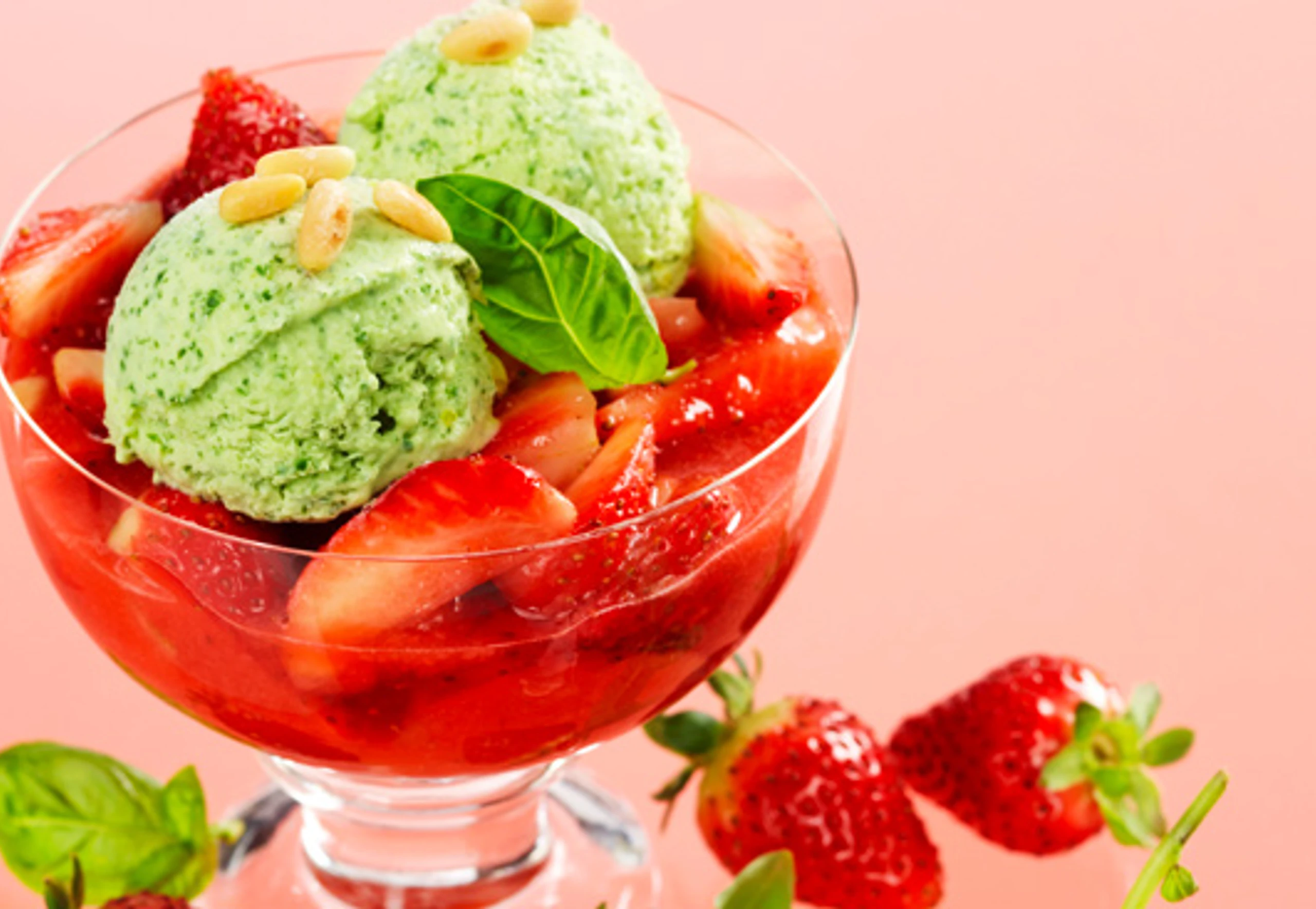 Basilikum-Pignoli-Eis mit Erdbeersalat