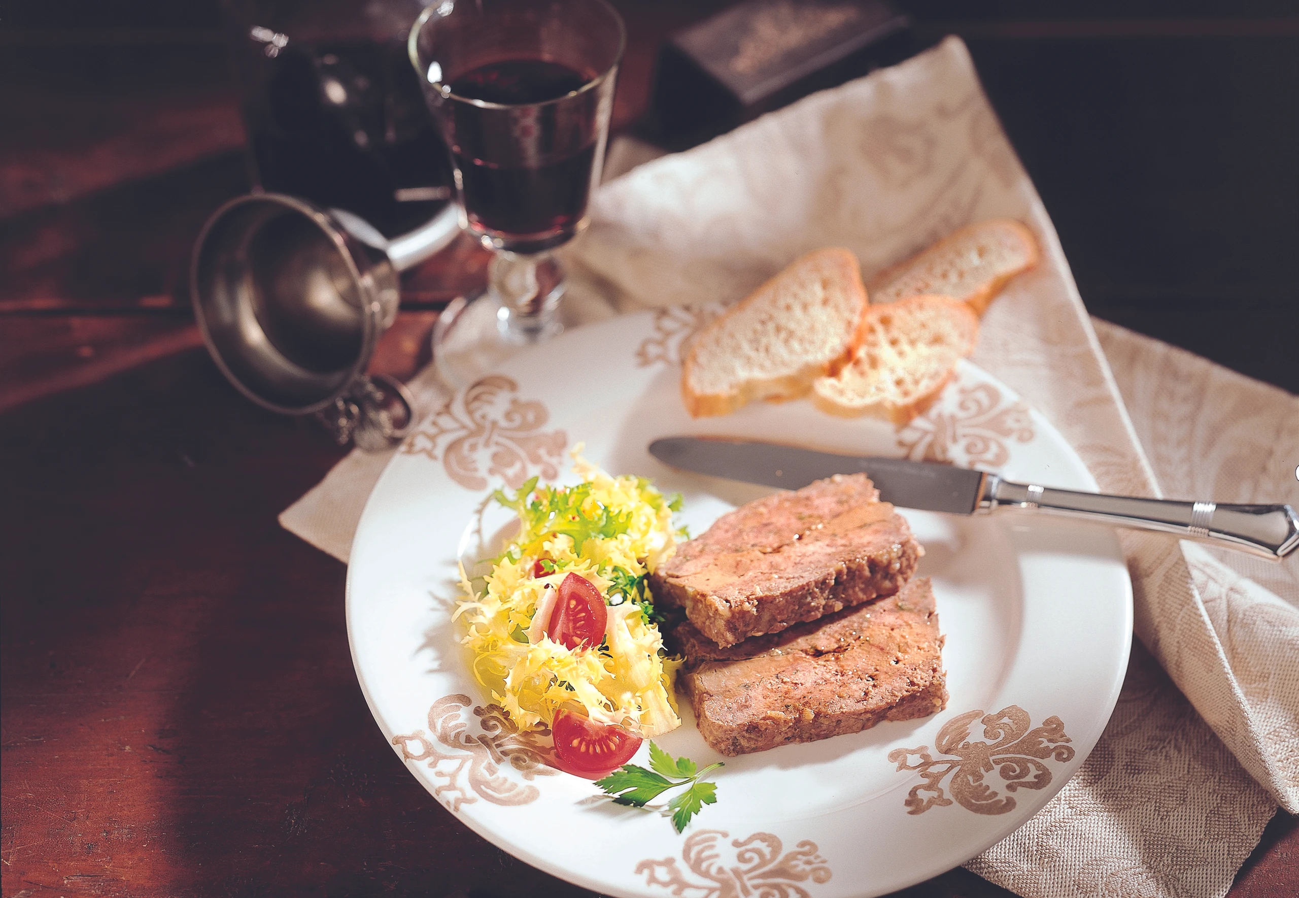 Backrohr auf 180 °C vorheizen. Eine kleine rechteckige Form (ca. 1 l Inhalt) einölen, die halbe Fleischmasse einfüllen, Leber in kleinen Stücken darauf legen, würzen und mit dem restlichen Fleisch bedecken. Die Lorbeerblätter und danach die Speckstreifen darauf legen. Die Form mit Alufolie zudecken, in einer mit Wasser halb gefüllten Pfanne ins Rohr stellen und ca. 11/2 Stunden garen.