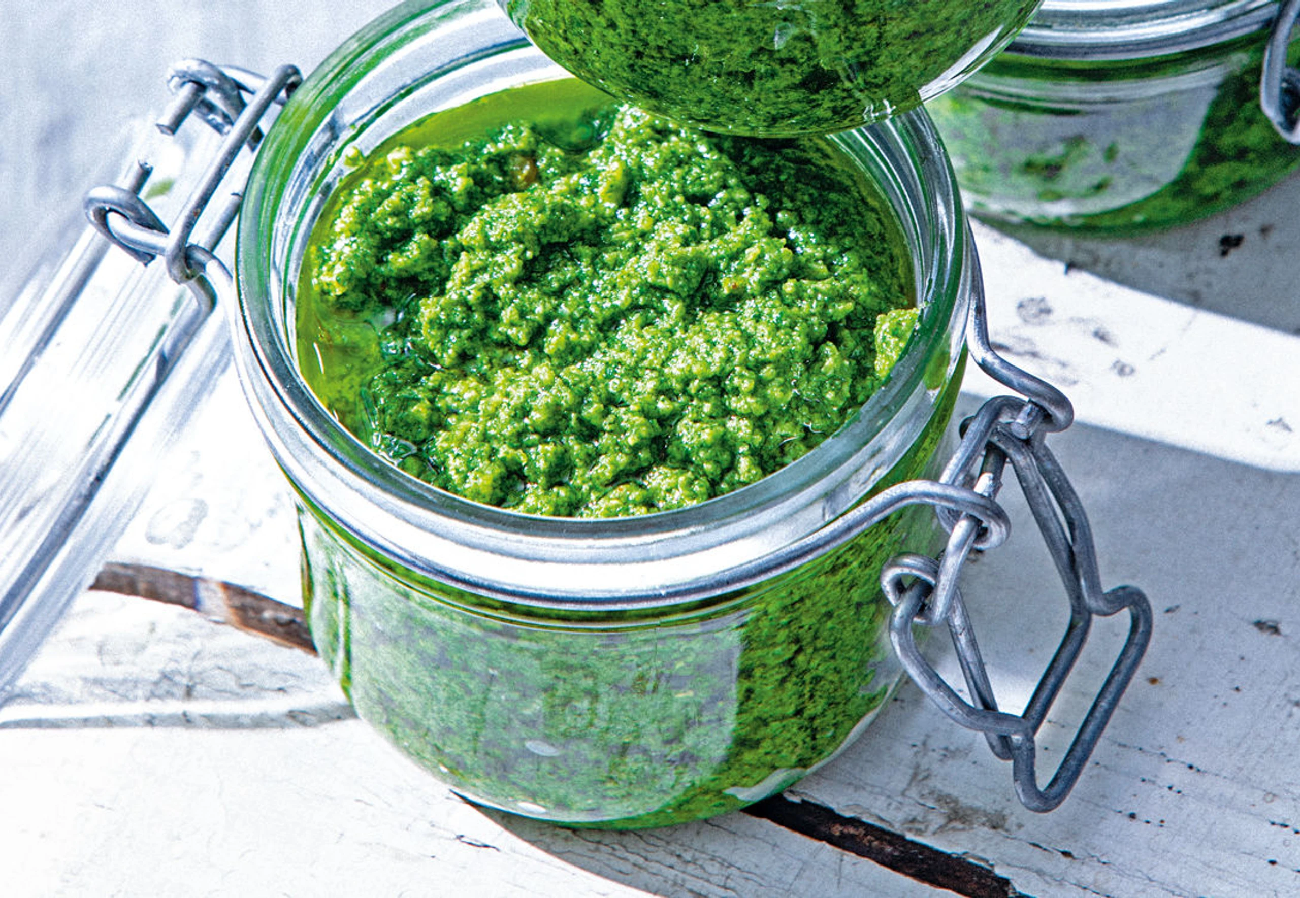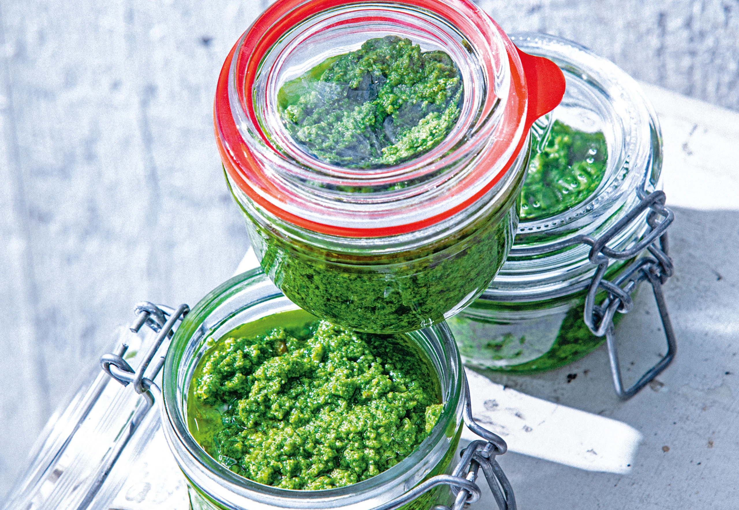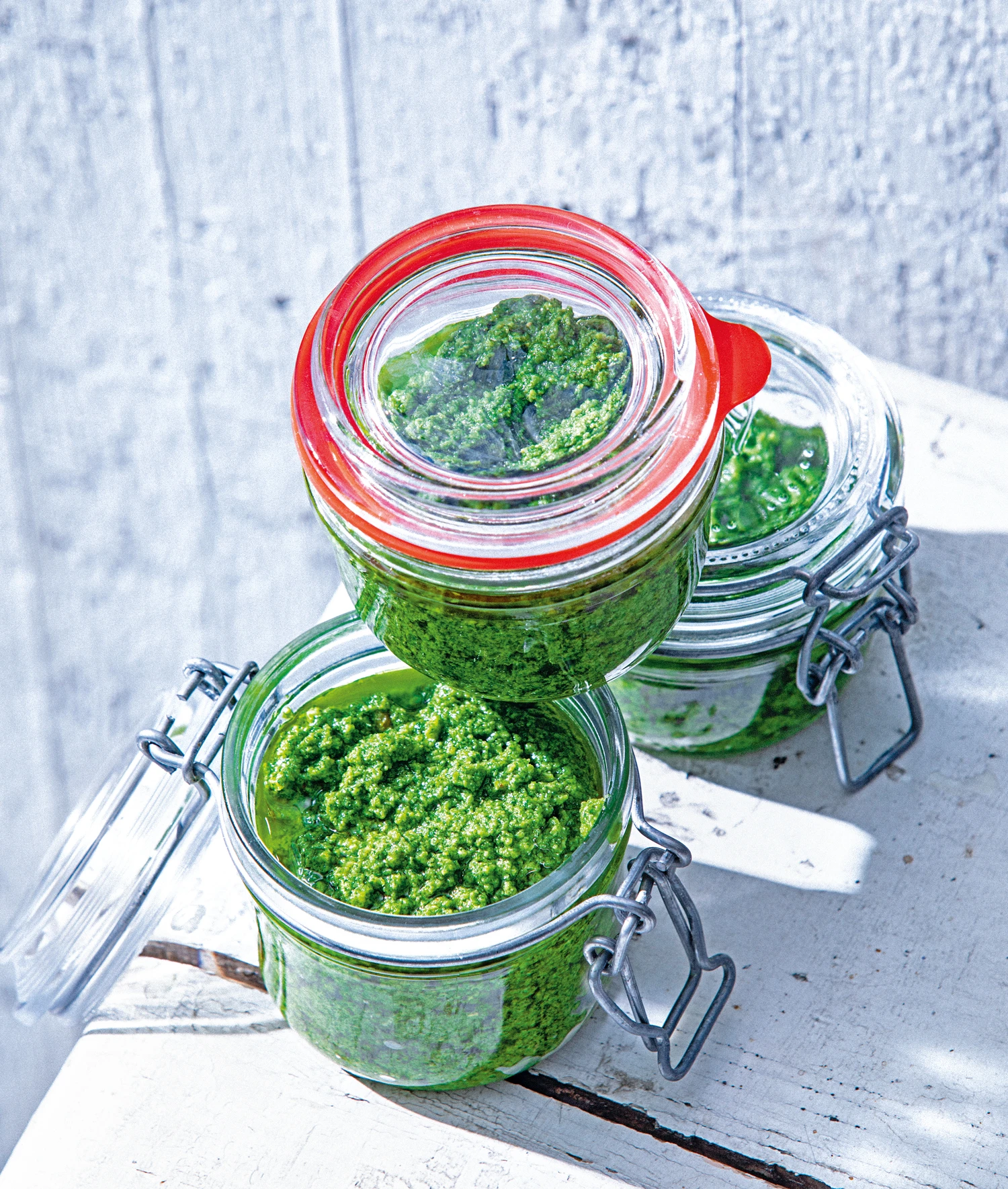 Pesto in Gläser füllen, verschließen und kühl stellen.