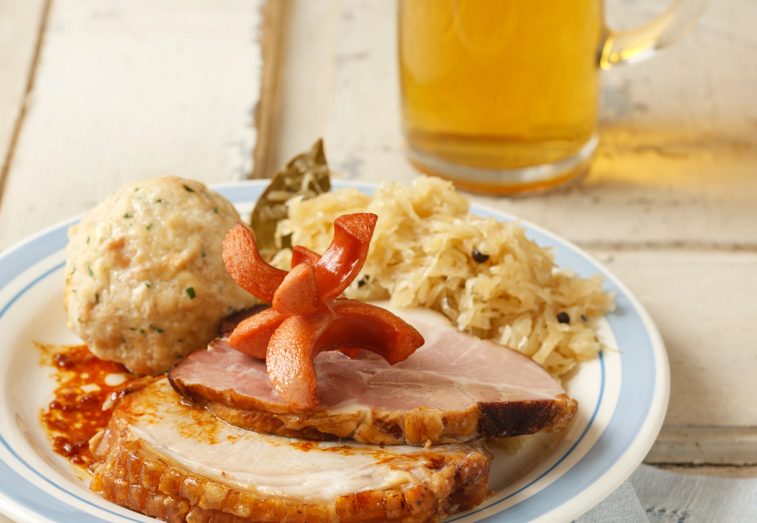 Würstel quer halbieren, an den Enden kreuzförmig einschneiden und in 3 Finger hoch Öl backen. Herausheben und abtropfen lassen. Selchfleisch und Schweinskarree in Scheiben schneiden. Fleisch und Würstel mit Knödeln, Kraut und Saft anrichten.