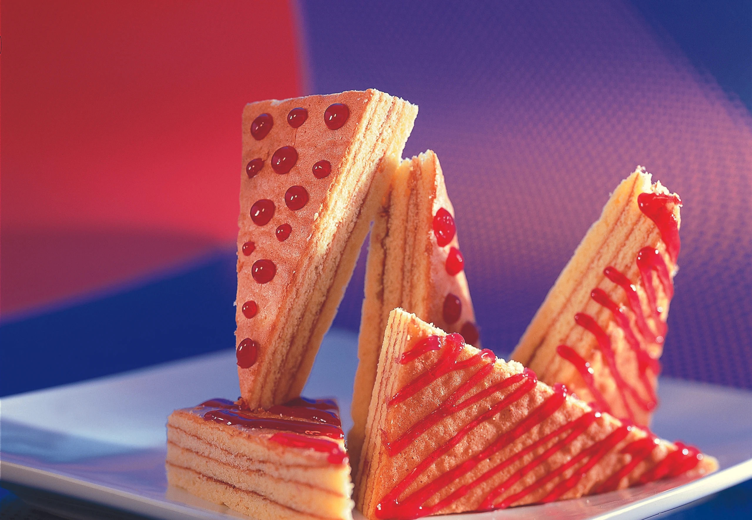Für die Garnitur Sirup mit Stärkemehl glatt rühren. Wasser aufkochen, Sirup zugießen und unter Rühren so lange köcheln, bis die Masse klar ist. Gelee überkühlen lassen, in ein Papierstanitzel füllen und die Kuchenstücke damit nach Belieben garnieren.