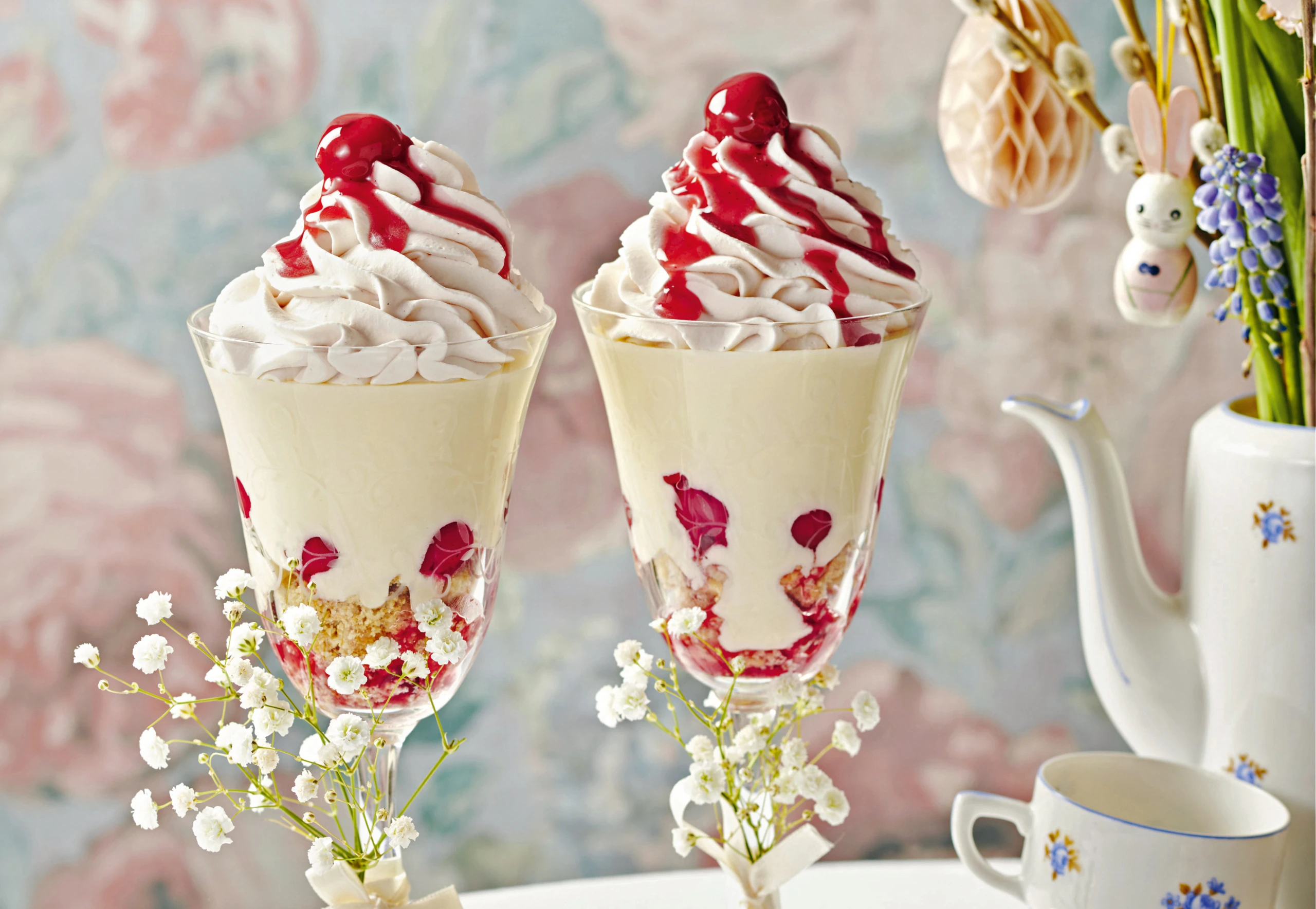 Für die Garnitur Obers, Zucker und Vanille cremig mixen und in einen Dressiersack mit Sterntülle füllen. Bayerische Creme mit dem Obers und den übrigen Weichseln garnieren.