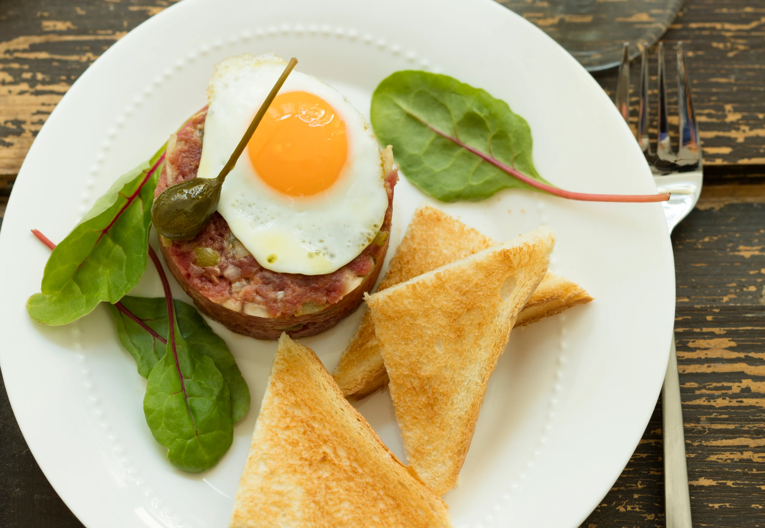- In einer Pfanne 2 EL Öl erhitzen, Eier behutsam hineinschlagen und braten. Eier aus der Pfanne nehmen und etwas abkühlen lassen. Tatar anrichten, mit Spiegeleiern und Kapern belegen und mit Mangold garniert servieren.