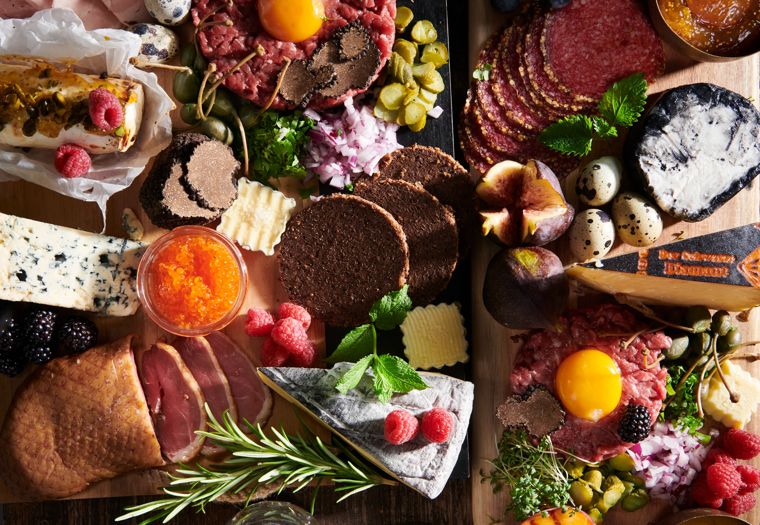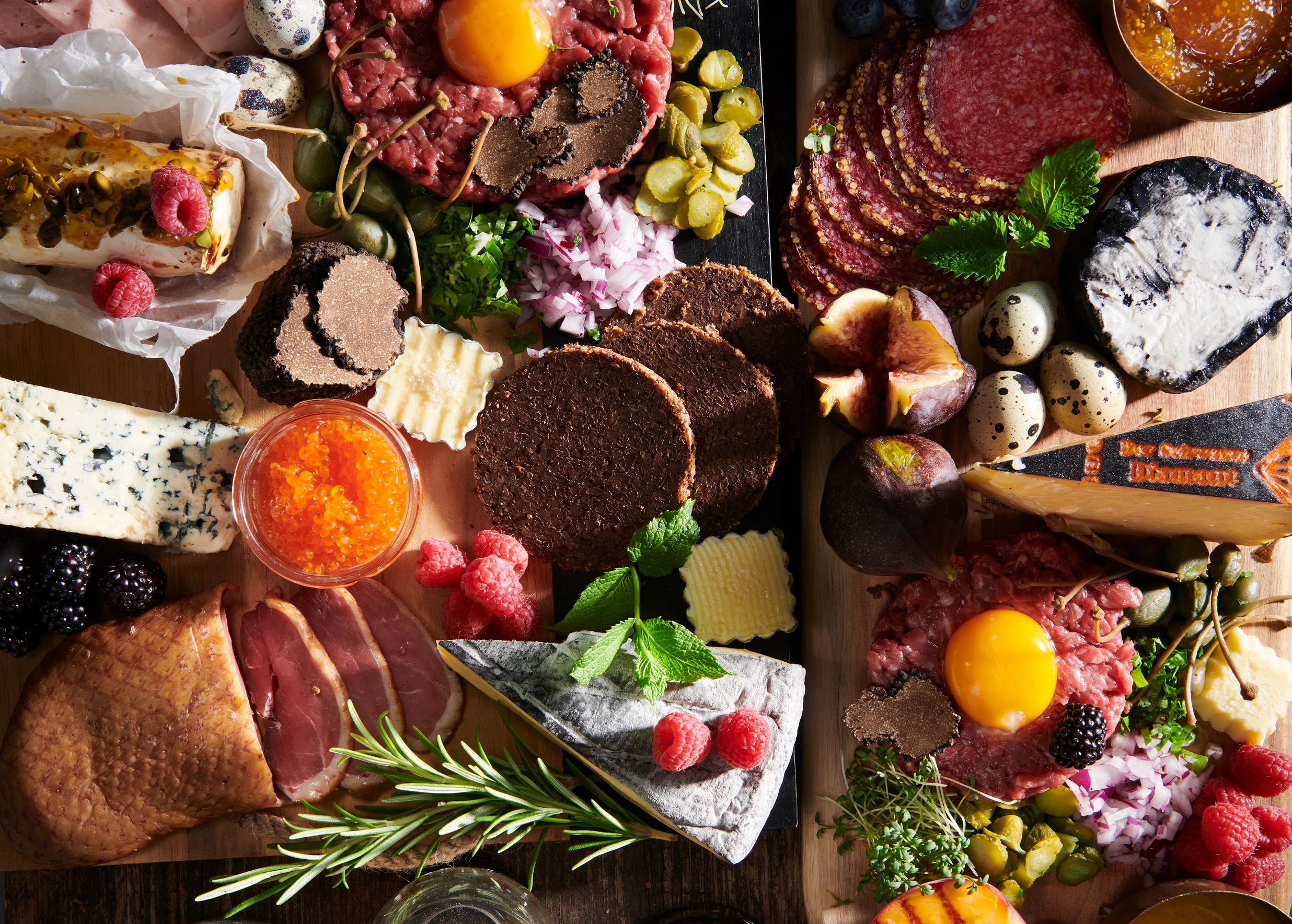 Für das Beef Tatar: Schalotten schälen. Schalotten, Kapern und Gurkerl fein würfeln. Fleisch in Scheiben, dann in Streifen schneiden und anschließend würfeln. Fleisch mit einem großen Messer sehr fein hacken. Fleisch, Schalotten, Kapern, Gurkerl, Petersilie, Paprikapulver, Senf und Tabasco gut verrühren. Tatar mit Salz und Pfeffer würzen, auf Brettern anrichten und mit Dottern belegen. Mit Kapernbeeren servieren.
