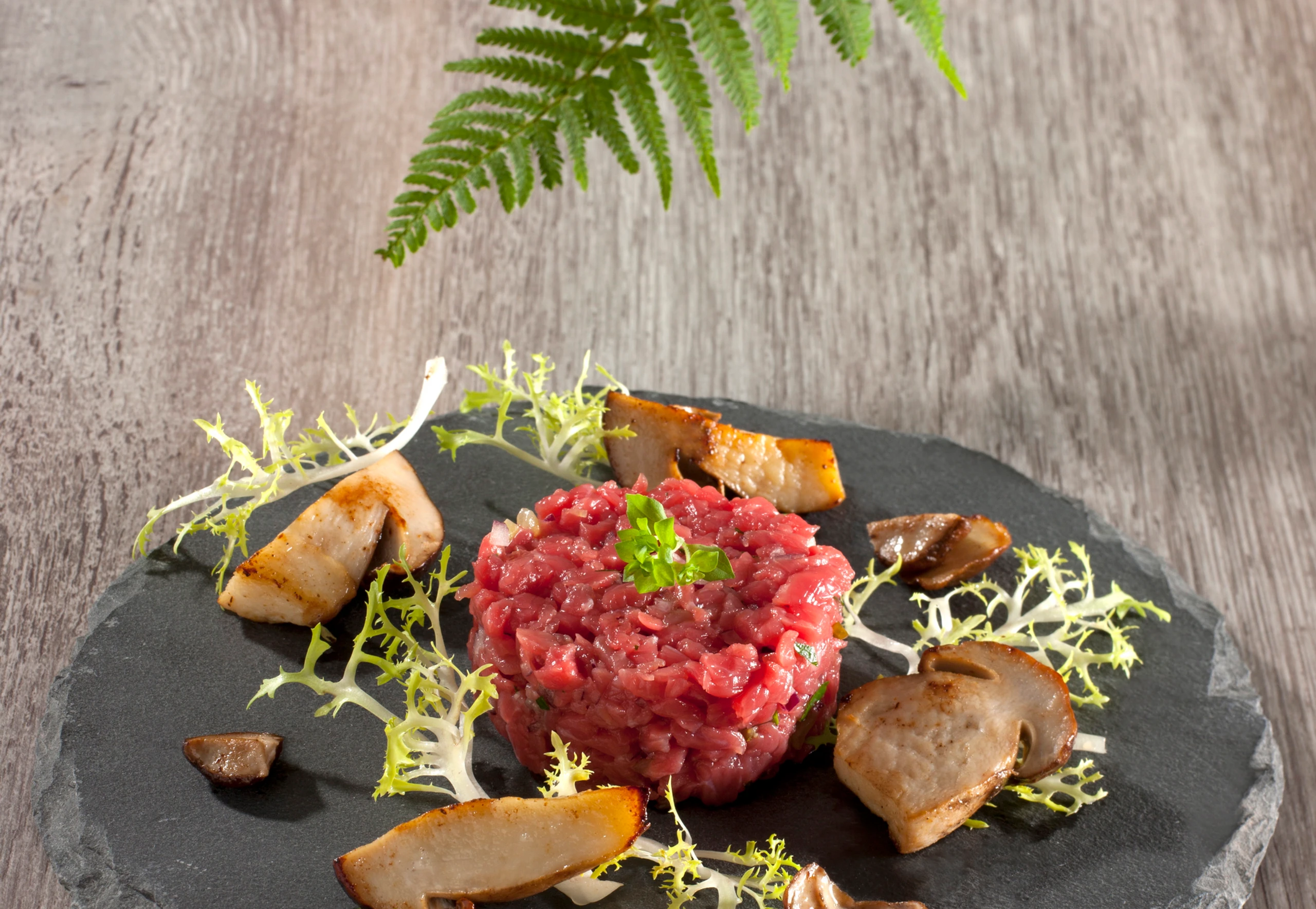 Beef Tatar mit Hilfe eines Ausstechringes in der Mitte der Teller anrichten. Mit Pilzen und Salat garniert servieren. Dazu passt besonders gut getoastetes Weißbrot.