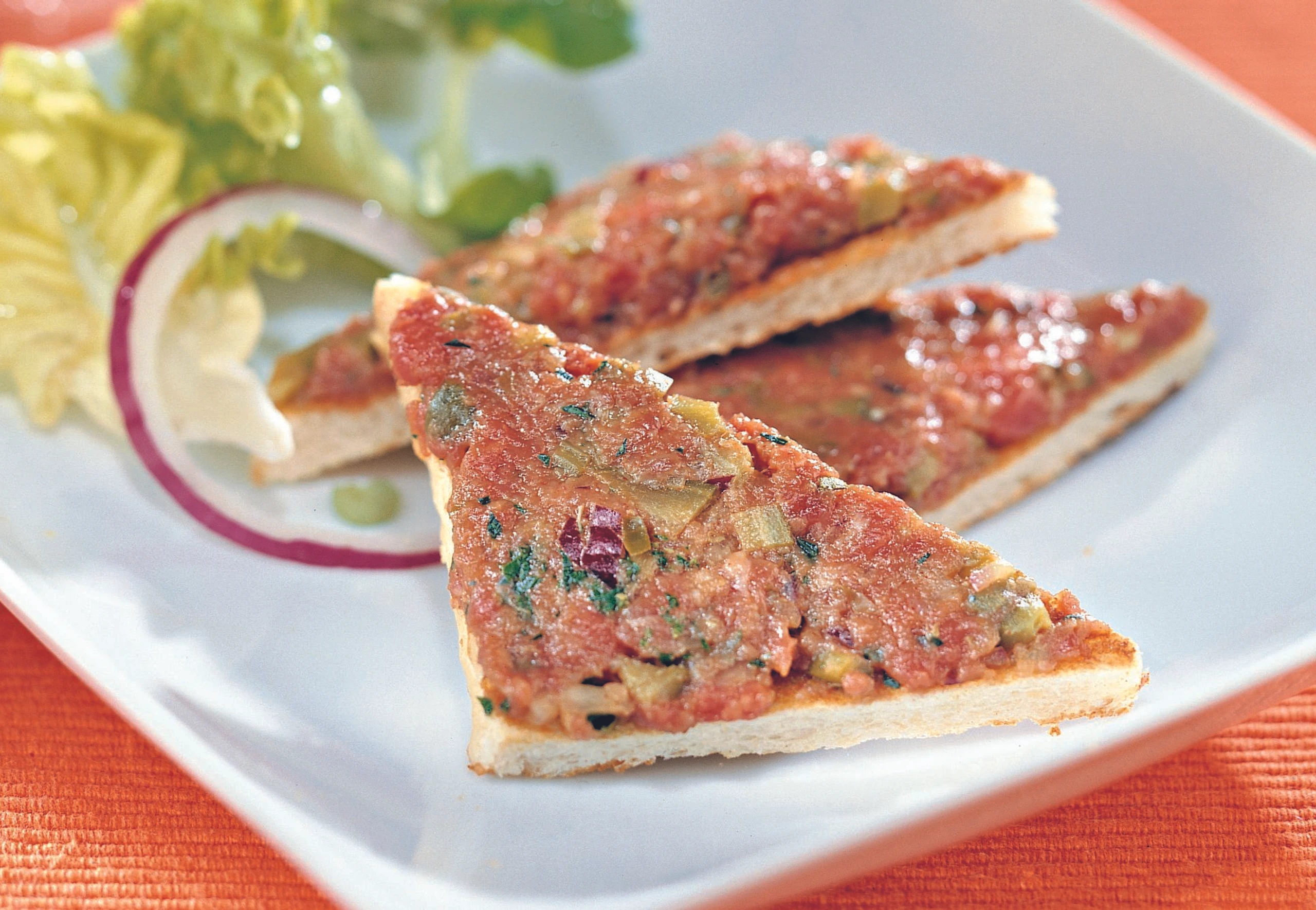 Salate zerpflücken. Brote toasten und diagonal halbieren. Toasts mit Salat und Tatar belegen.
