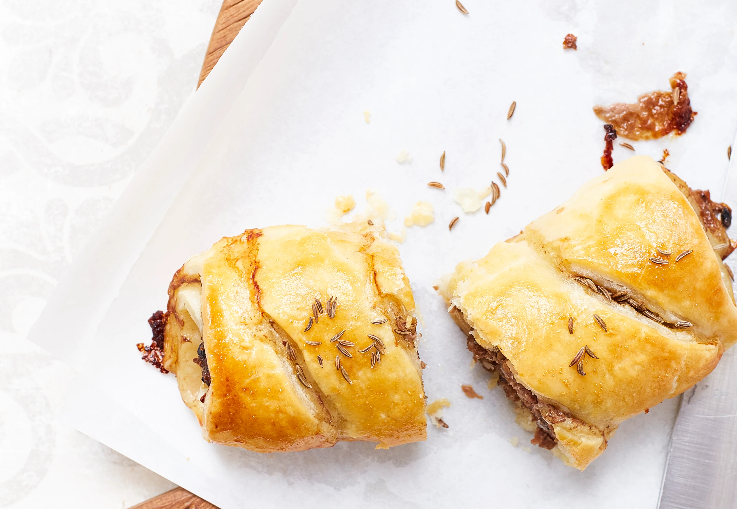 Blätterteig aufrollen, Teig vierteln. Entlang der Längsseite jedes Teigstückes die Fülle setzen, Teig über die Fülle eng einrollen. Teigröllchen mit Ei dünn bestreichen und auf das Blech setzen. Röllchen quer nicht zu tief einschneiden, mit Kümmel bestreuen und im Rohr (mittlere Schiene) ca. 15 Minuten backen.
