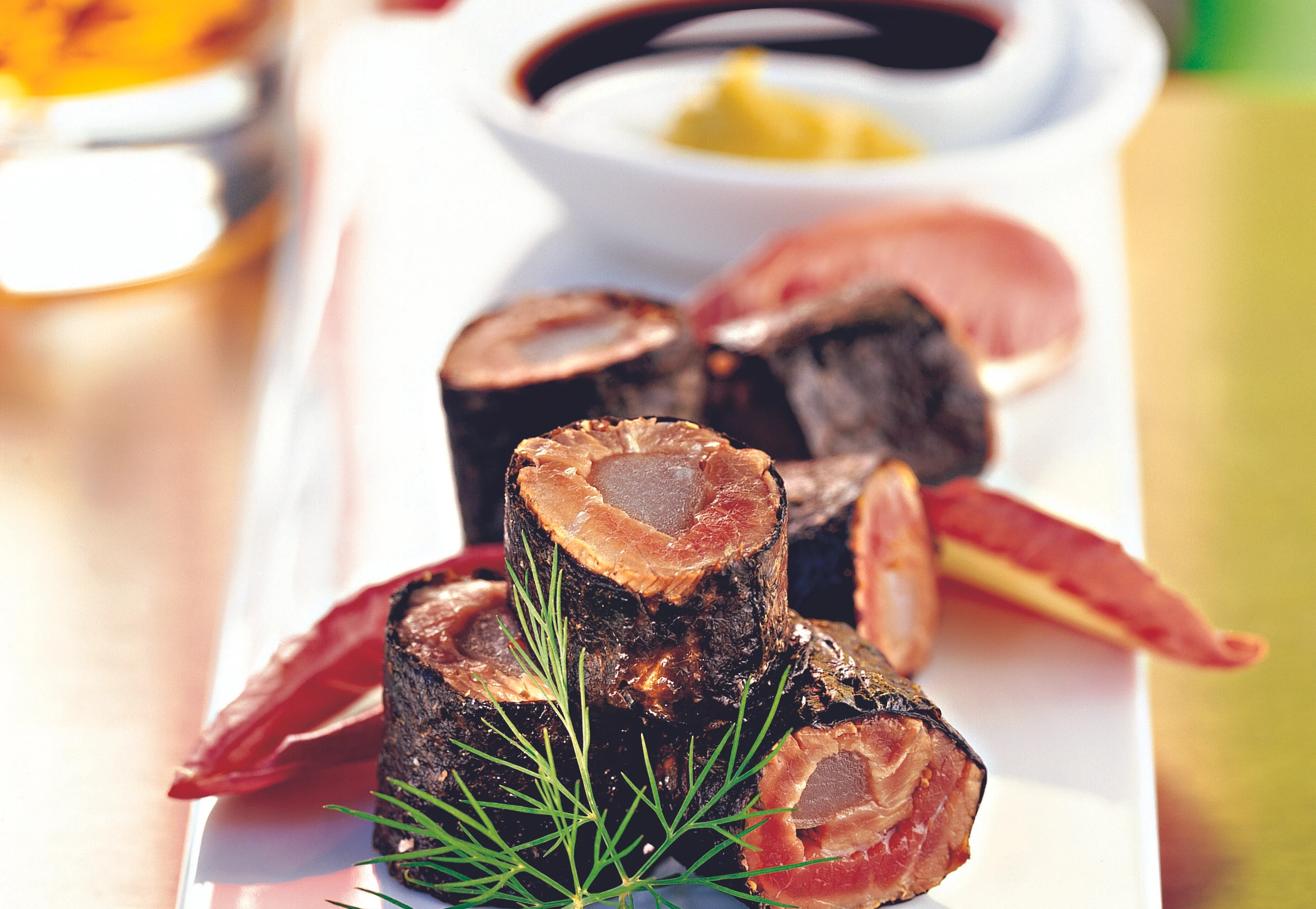 Fleischscheiben der Länge nach mit Gurkenstiften belegen und straff einrollen. Rollen in die Noriblätter wickeln, überschüssiges Noriblatt wegschneiden. Rolle an der „Klebestelle“ befeuchten und andrücken.