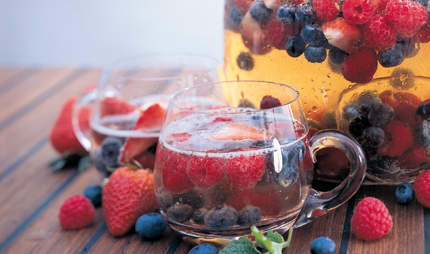 Für den Ansatz Beeren verlesen, mit Zucker, Kirschlikör, Weinbrand und 500 ml vom Wein mischen und mit Frischhaltefolie zugedeckt für 2 Stunden kühl stellen.