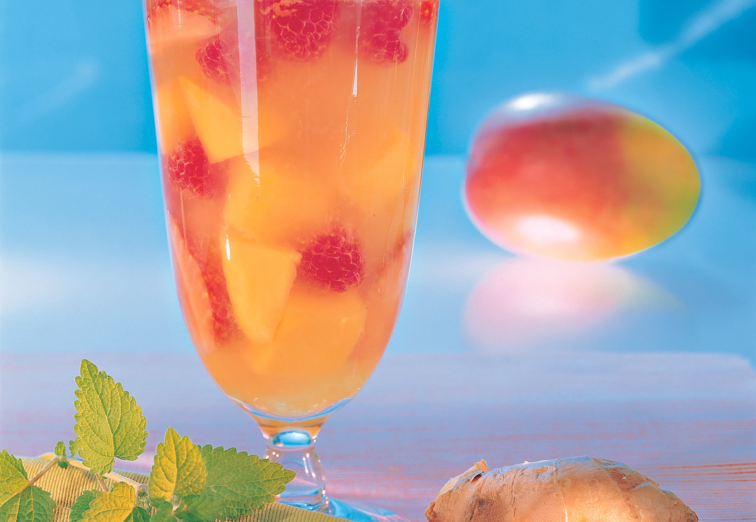 Mango, Himbeeren und Erdbeeren untermischen. Den Punsch erhitzen, aber nicht kochen.