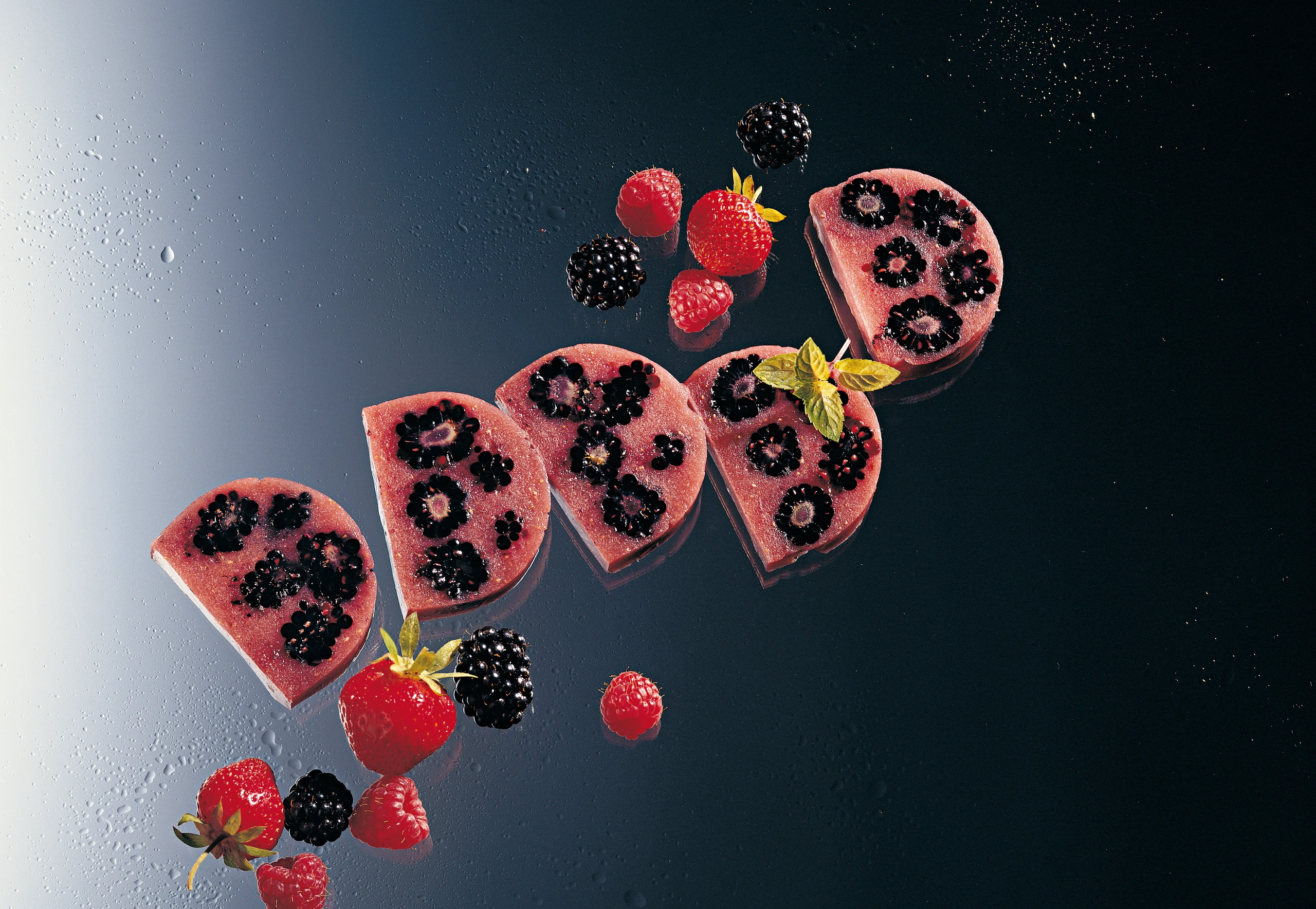 Vor dem Servieren Beerenterrine aus der Form stürzen, Folie abziehen und Terrine in gleichdicke Scheiben schneiden. Dazu passt Vanillesauce.