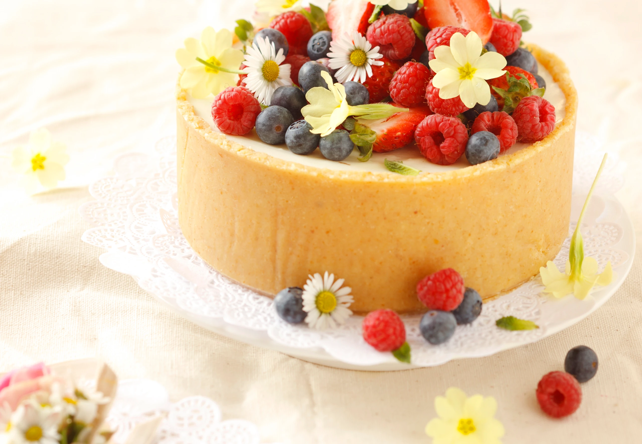 Für die Garnitur Beeren verlesen. Kuchen aus der Form lösen, mit Beeren, Minzeblättern und Blüten garnieren.