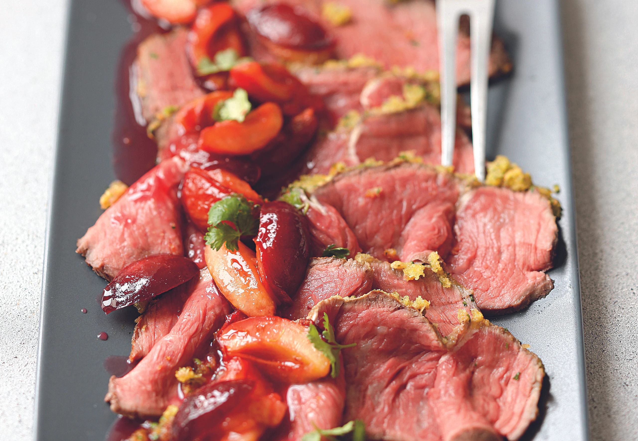 Beiried aufschneiden, mit Zwetschken und Korianderblättern garniert servieren.